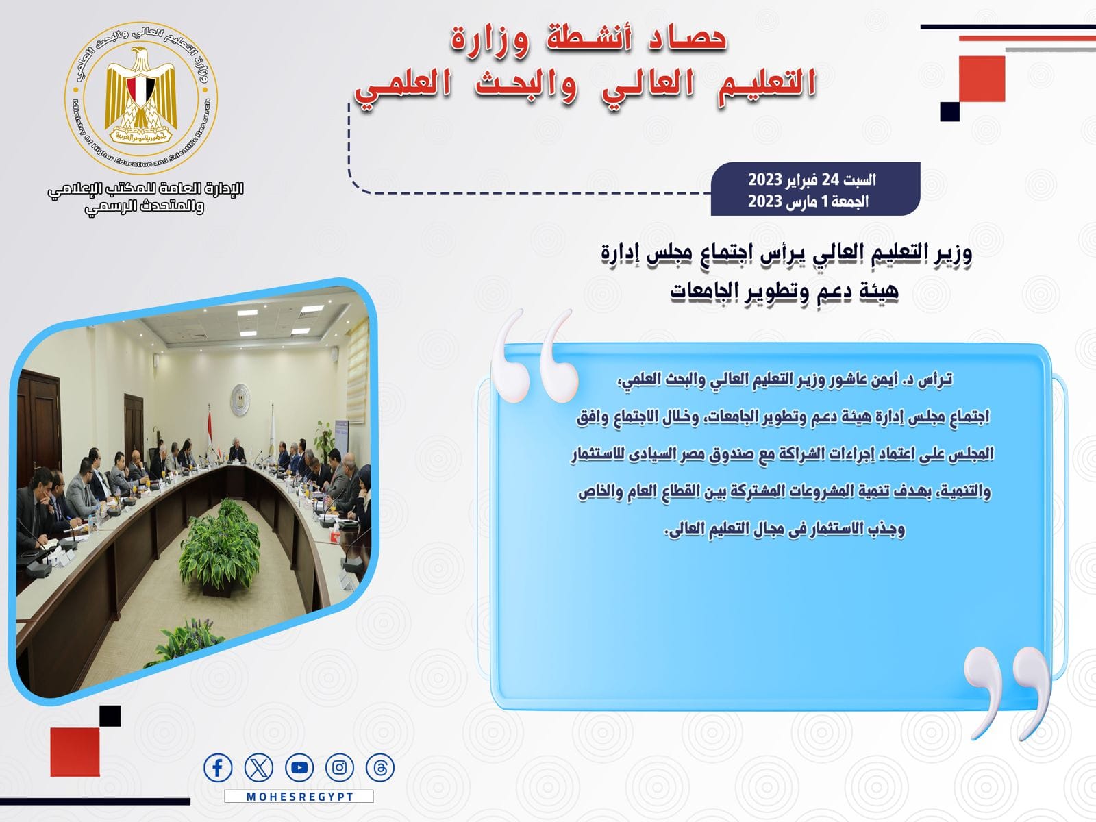 5) ترأس د. أيمن عاشور وزير التعليم العالي والبحث العلمي، اجتماع مجلس إدارة هيئة دعم وتطوير الجامعات، وخلال الاجتماع وافق المجلس على اعتماد إجراءات الشراكة مع صندوق مصر السيادى للاستثمار والتنمية، بهدف تنمية المشروعات المشتركة بين القطاع العام والخاص وجذب الاستثمار فى مجال التعليم العالى.