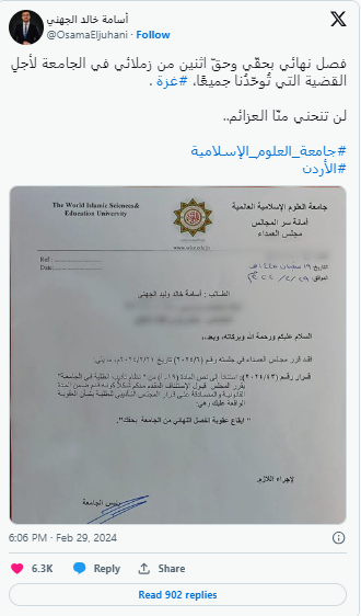 ونشر الطالب الأردني أسامة خالد الجهني، وهو أحد الطلبة المفصولين من الجامعة، في تغريدة على منصة إكس: "فصل نهائي بحقّي وحقّ اثنين من زملائي في الجامعة لأجلِ القضية التي تُوحِّدُنا جميعاً، غزة لن تنحني منّا العزائم..".