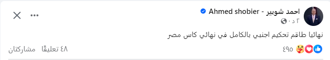 وكتب أحمد شوبير، على صفحته الشخصية على موقع التواصل الاجتماعي "فيس بوك"، قائلا: "نهائياً طاقم تحكيم أجنبي بالكامل في نهائي كأس مصر".