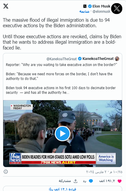 وكتب ماسك على صفحته في منصة “X”: “إلى أن يتم رفع هذه الأوامر التنفيذية، فإن ادعاءات بايدن بأنه يريد مكافحة الهجرة غير الشرعية كاذبة”.