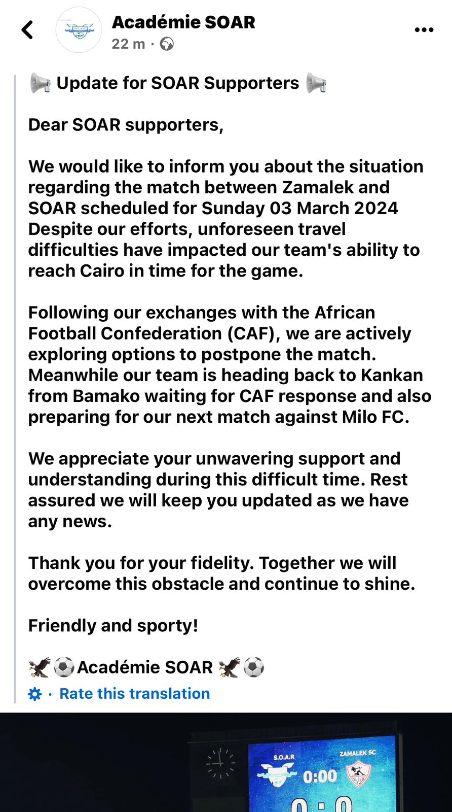 وبعد التبادلات التي أجريناها مع الاتحاد الأفريقي لكرة القدم (CAF)، فإننا ندرس بشكل فعال خيارات تأجيل المباراة. في هذه الأثناء، يعود فريقنا إلى كانكان من باماكو في انتظار رد الاتحاد الإفريقي لكرة القدم ويستعد أيضًا لمباراتنا القادمة ضد ميلو إف سي.