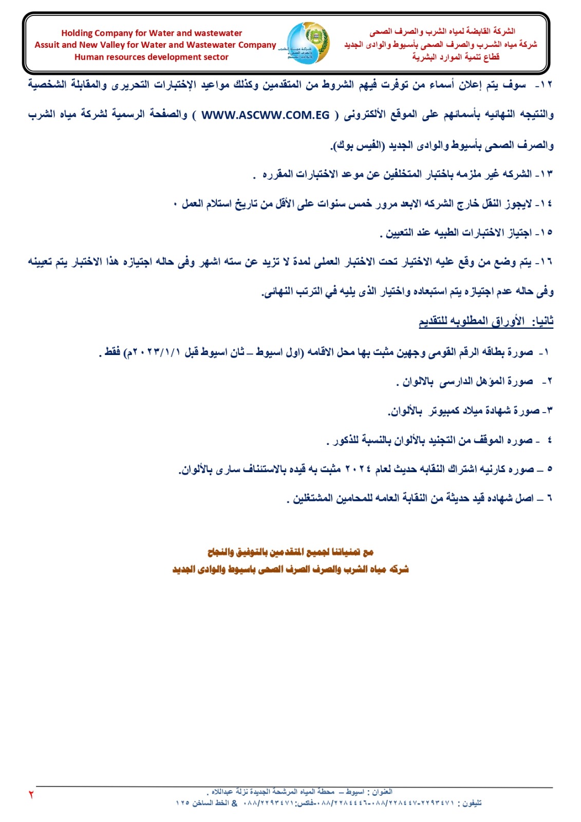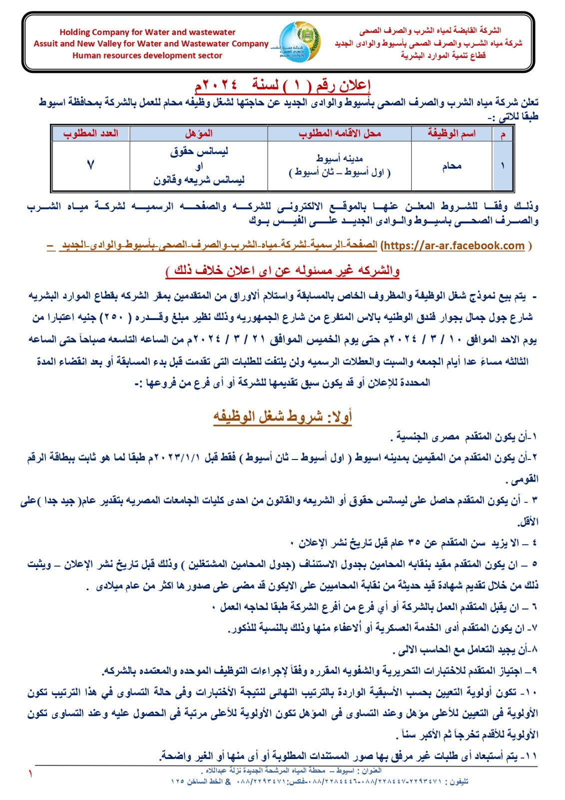 مياه أسيوط تعلن عن حاجتها لشغل وظيفة (محام) بالاعلان رقم (1) لسنة 2024م