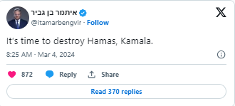 وكتب بن غفير في منشور عبر منصة "إكس" باللغة الإنجليزية: "حان الوقت لتدمير حماس، كامالا".