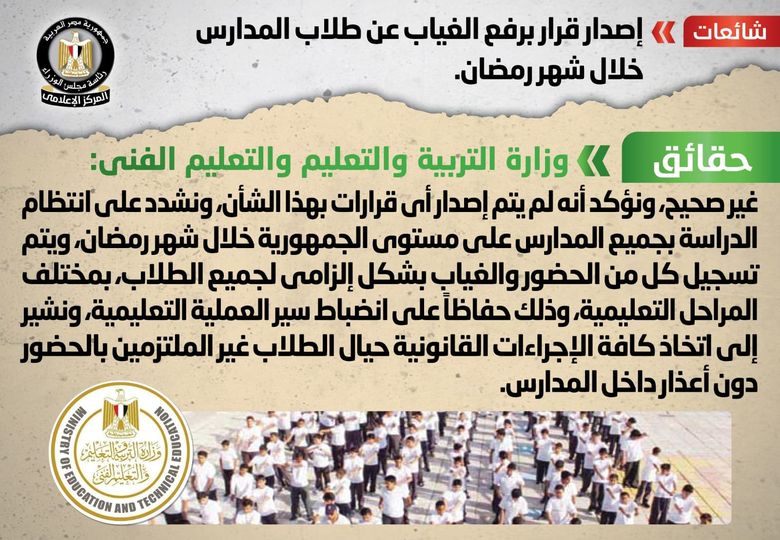 انتشر في بعض المواقع الإلكترونية وصفحات التواصل الاجتماعي أنباء بشأن إصدار قرار برفع الغياب عن طلاب المدارس خلال شهر رمضان، وقد قام المركز الإعلامي لمجلس الوزراء بالتواصل مع وزارة التربية والتعليم والتعليم الفني، والتي نفت تلك الأنباء، مُؤكدةً أنه لا صحة لرفع الغياب عن طلاب المدارس خلال شهر رمضان، وأنه لم يتم إصدار أي قرارات بهذا الشأن، مُشددةً على انتظام الدراسة بجميع المدارس على مستوى الجمهورية خلال شهر رمضان، ويتم تسجيل كل من الحضور والغياب بشكل إلزامي لجميع الطلاب، بمختلف المراحل التعليمية، وذلك حفاظاً على انضباط سير العملية التعليمية، مُشيرةً إلى اتخاذ كافة الإجراءات القانونية حيال الطلاب غير الملتزمين بالحضور دون أعذار داخل المدارس.