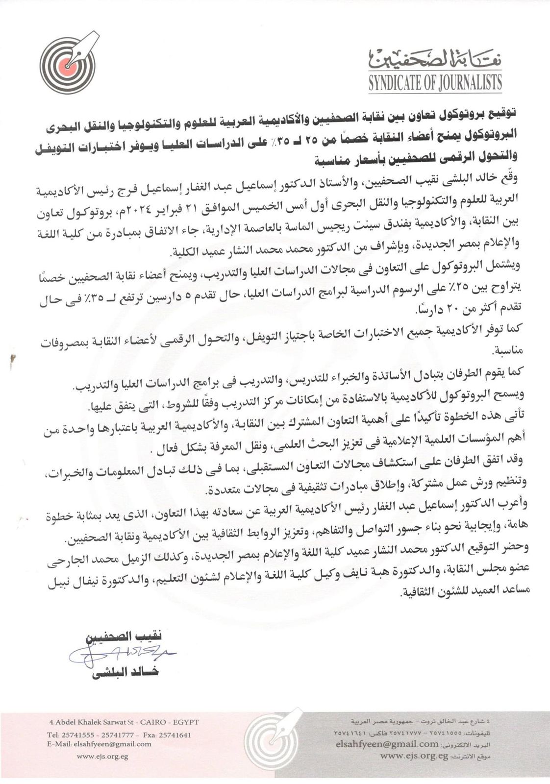 فتحت الأكاديمية العربية للعلوم والتكنولوجيا والنقل البحرى بالتعاون مع نقابة الصحفيين باب قبول طلبات الزملاء الراغبين من أعضاء النقابة الاستفادة من التخفيضات المعلن عنها ضمن البروتوكول الموقّع بين نقابة الصحفيين، والأكاديمية للحصول على برنامج ماجستير الاتصال السياسى والدبلوماسى، وبرنامج ماجستير صناعة الفيلم، الحصول على خطاب من مكتب النقيب بالبرنامج، الذى يرغب الالتحاق به، خلال الفترة من 5 مارس إلى 31 مارس 2024م.