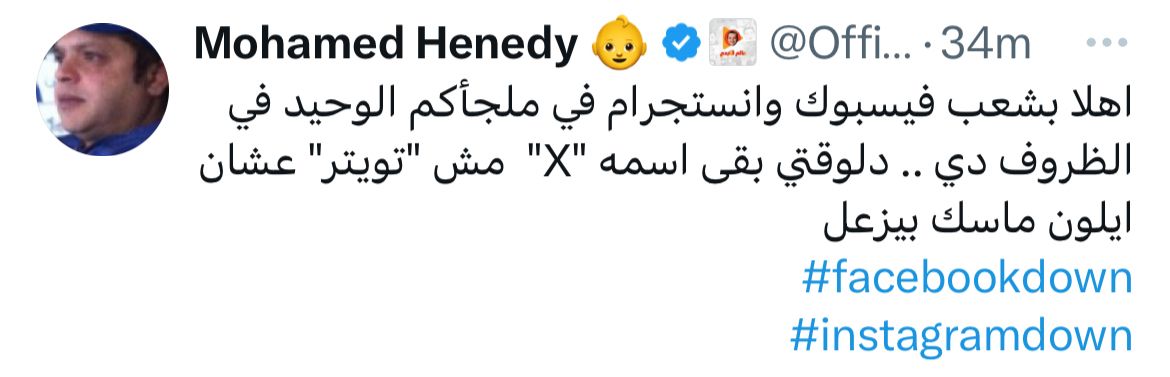 وقال هنيدي في تغريدة ساخرة من عطل فيس بوك وانستجرام، على موقع التواصل الاجتماعي "x"، تويتر سابقًا: أهلا بشعب فيسبوك وانستجرام في ملجأكم الوحيد في الظروف دي.. دلوقتي بقى اسمه "x" مش تويتر، عشان ايلون ماسك بيزعل".