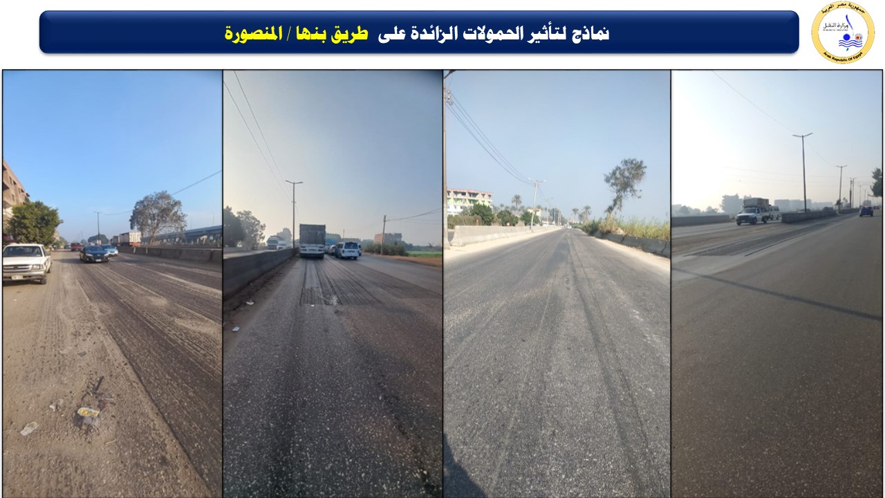 ومع تلاحظ تكرار ظاهرة عدم الالتزام بالحمولات المسموح بها على شبكة الطرق مما تسبب في آثار تدميرية على شبكة الطرق و انهيار الكباري وفواصلها بمعدل يفوق ما يتم تحصيله من غرامات مثل كباري وطرق (الطريق الدولي الساحلي والكباري الواقعة عليه " كوبري سوريجان / السيالة / اولاد حمام / البستان " بنطاق محافظة دمياط– كوبري كفر عمار على طريق رافد جمصة بنطاق محافظة الدقهلية – محور 30 يونيو – الطريق الدائري الاقليمي – طريق شبرا / بنها الحر – طريق بنها / المنصورة – طريق الصعيد الصحراوي الغربي – طريق شربين / دمياط الغربي – طريق رافد بلطيم /كفر الشيخ / الحامول بالإضافة الى نقص العمر التصميمي للطرق والكباري وزيادة المعدل الزمني لاعمال الصيانة و ارتفاع تكلفة تلك الصيانة نتيجة الحمولات الزائدة كما تسببت زيادة الحمولات عن المسموح بها في وقوع العديد من الحوادث على شبكة الطرق والكباري وازهاق لارواح المواطنين و وجود تكاليف غير مباشرة لإهلاك الشاحنات نتيجة زيادة معدلات الصيانة للمركبات (تغيير اطارات نتيجة زيادة معدل التآكل - تغيير محاور المركبات لتتحمل زيادة احجام الشاحنات - نقص العمر الافتراضى للسيارة) بالاضافة الى تأثير الحمولات الزائدة في انخفاض حجم الصادرات المصرية الى ليبيا والسودان والاردن والعراق ودول الخليج نتيجة لمنع هذه الدول دخول الشاحنات المصرية لأراضيها بحمولات زائدة