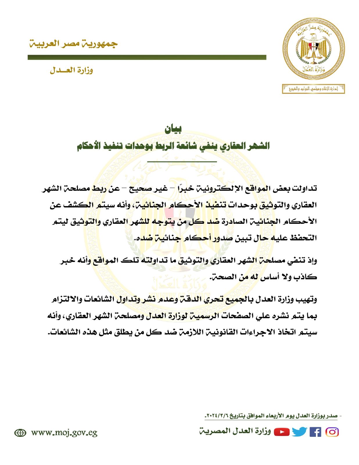 وتهيب وزارة العدل بالجميع تحري الدقة وعدم نشر وتداول الشائعات والالتزام بما يتم نشره علي الصفحات الرسمية لوزارة العدل ومصلحة الشهر العقاري، وأنه سيتم اتخاذ الاجراءات القانونية اللازمة ضد كل من يطلق مثل هذه الشائعات.