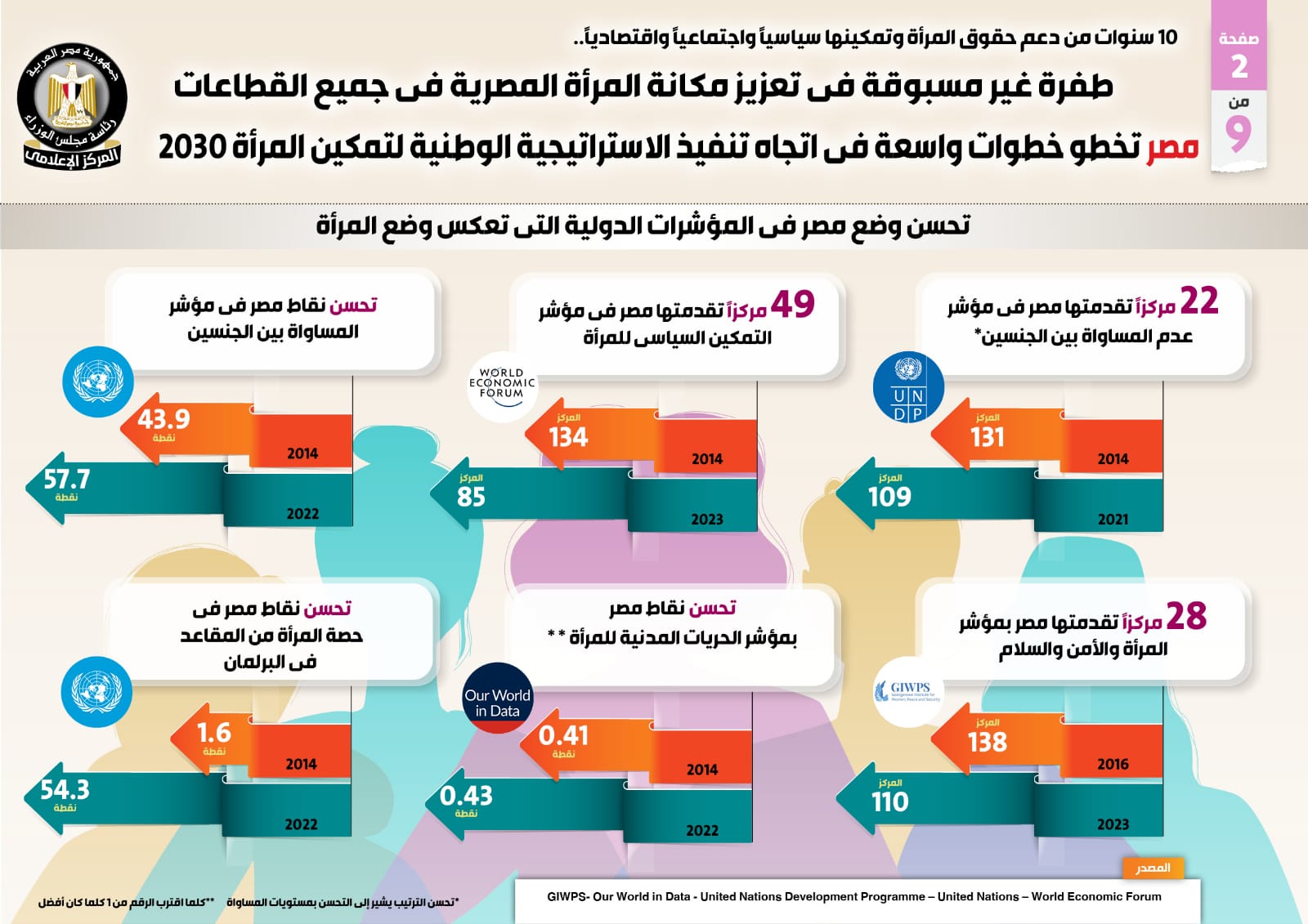 وعلى صعيد متصل، تقدمت مصر 28 مركزاً بمؤشر المرأة والأمن والسلام GIWPS))، حيث شغلت المركز 110 عام 2023، مقابل المركز 138 عام 2016، كما تحسنت نقاط مصر في حصة المرأة من المقاعد في البرلمان لتصل إلى 54.3 نقطة عام 2022، مقابل 1.6 نقطة عام 2014.