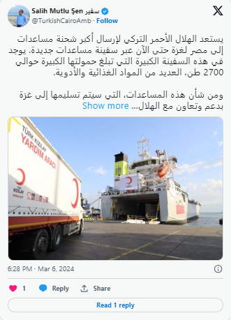 وكتب سفير تركيا في القاهرة، صالح موتلو شن، على منصة إكس: "من شأن هذه المساعدات، التي سيتم تسليمها إلى غزة بدعم وتعاون مع الهلال الأحمر المصري، أن تبقي على آمال الشعب الفلسطيني حية قبيل شهر رمضان".