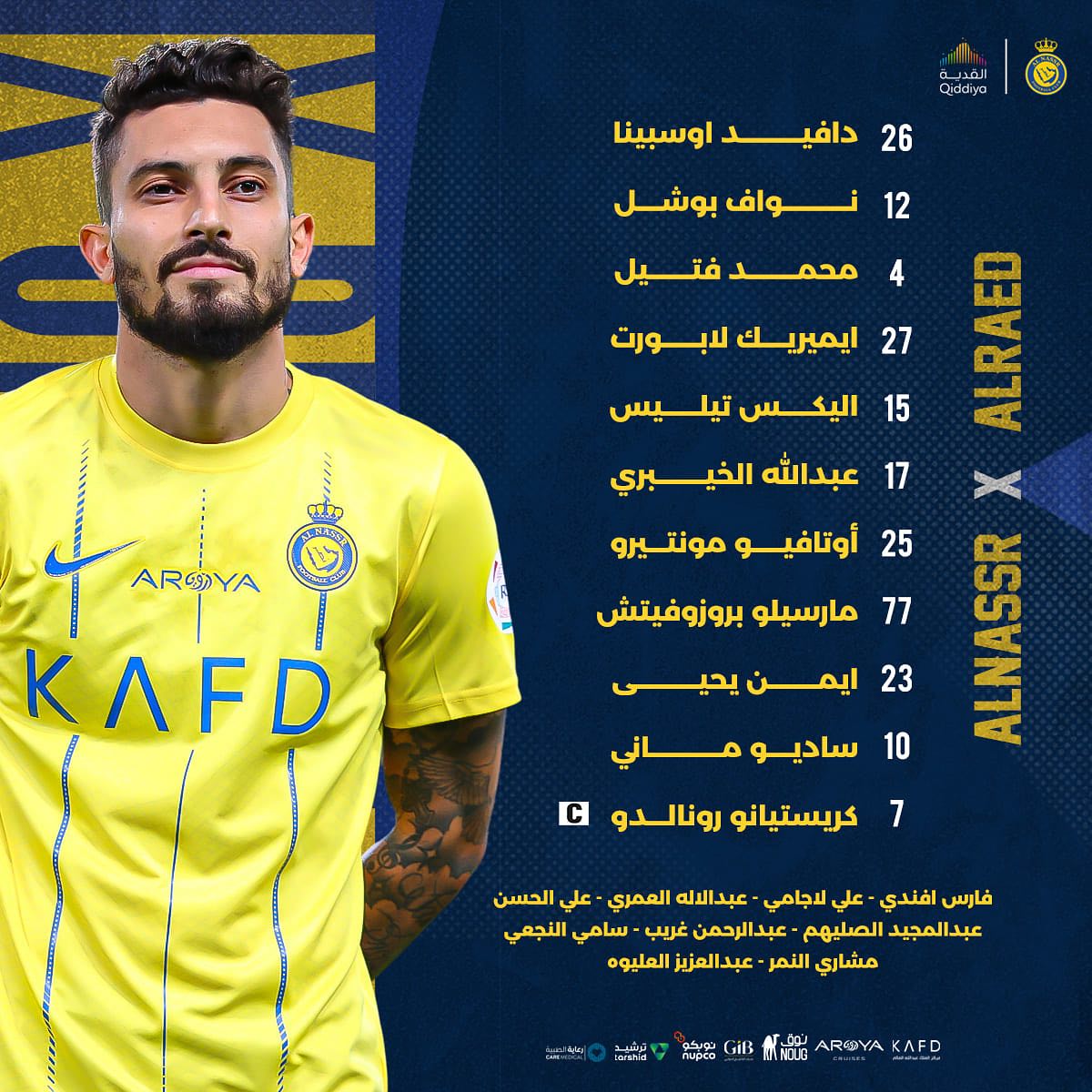 اعلن الجهاز الفني للفريق الاول لكرة القدم بنادي النصر السعودي تشكيله الرسمي لمباراة الرائد المقرر لها بعد قليل ضمن منافسات دوري روشن للمحترفين.