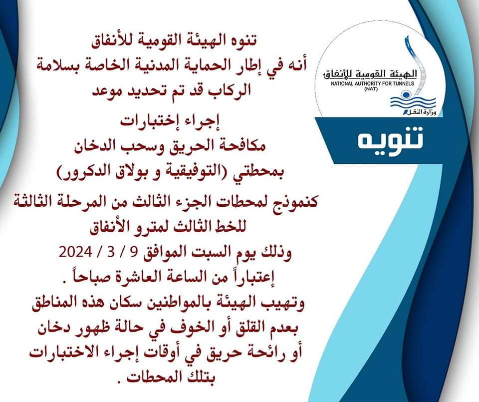 تنوه الهيئة القومية للأنفاق أنه في إطار الحماية المدنية الخاصة بسلامة الركاب قد تم تحديد موعد إجراء إختبارات مكافحة الحريق وسحب الدخان بمحطتي (التوفيقية و بولاق الدكرور) كنموذج لمحطات الجزء الثالث من المرحلة الثالثة للخط الثالث لمترو الأنفاق وذلك يوم السبت الموافق 9/3/2024 إعتباراً من الساعة العاشرة صباحاً .
