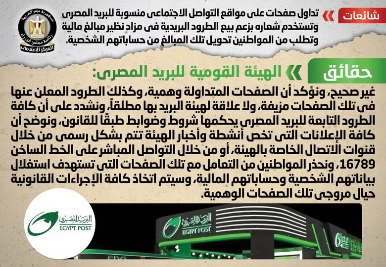 تداول صفحات على مواقع التواصل الاجتماعي منسوبة للبريد المصري وتستخدم شعاره بزعم بيع الطرود البريدية في مزاد نظير مبالغ مالية وتطلب من المواطنين تحويل تلك المبالغ من حساباتهم الشخصية، وقد قام المركز الإعلامي لمجلس الوزراء بالتواصل مع الهيئة القومية للبريد المصري، والتي نفت تلك الأنباء، مؤكدةً أنه لا صحة لبيع الطرود البريدية في مزاد نظير مبالغ مالية أو طلب أي تحويلات مالية من المواطنين من حساباتهم الشخصية، وأن الصفحات المتداولة وهمية، وكذلك الطرود المعلن عنها في تلك الصفحات مزيفة، ولا علاقة لهيئة البريد بها مطلقاً، مُشددةً على أن كافة الطرود التابعة للبريد المصري يحكمها شروط وضوابط طبقًا للقانون، مُوضحةً أن كافة الإعلانات التي تخص أنشطة وأخبار الهيئة تتم بشكل رسمي من خلال قنوات الاتصال الخاصة بالهيئة، أو من خلال التواصل المباشر على الخط الساخن 16789، مُحذرةً المواطنين من التعامل مع تلك الصفحات، التي تستهدف استغلال بياناتهم الشخصية وحساباتهم المالية، وسيتم اتخاذ كافة الإجراءات القانونية حيال مروجي تلك الصفحات الوهمية.