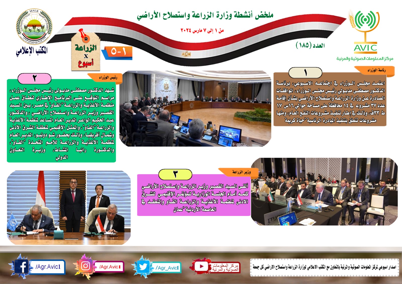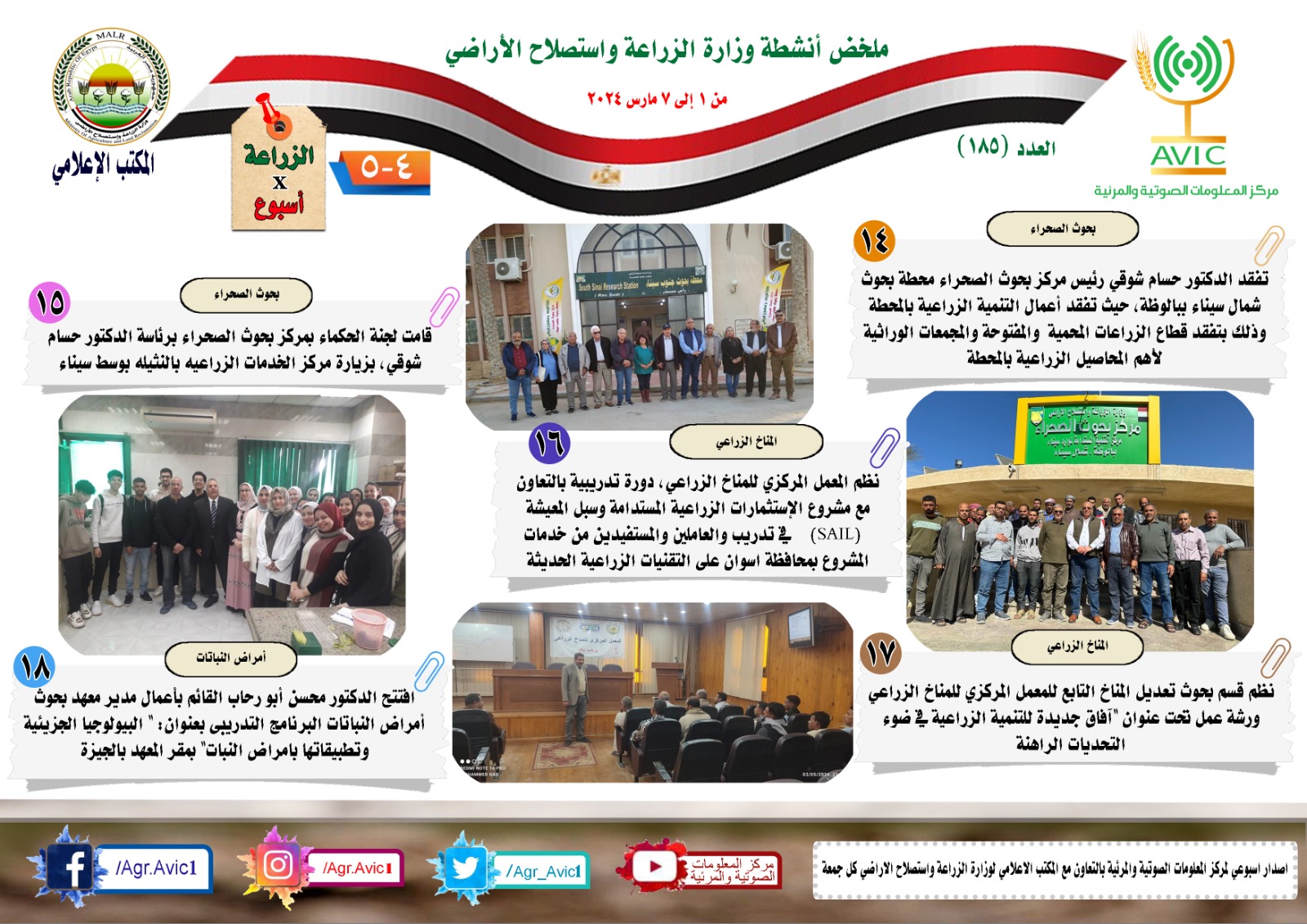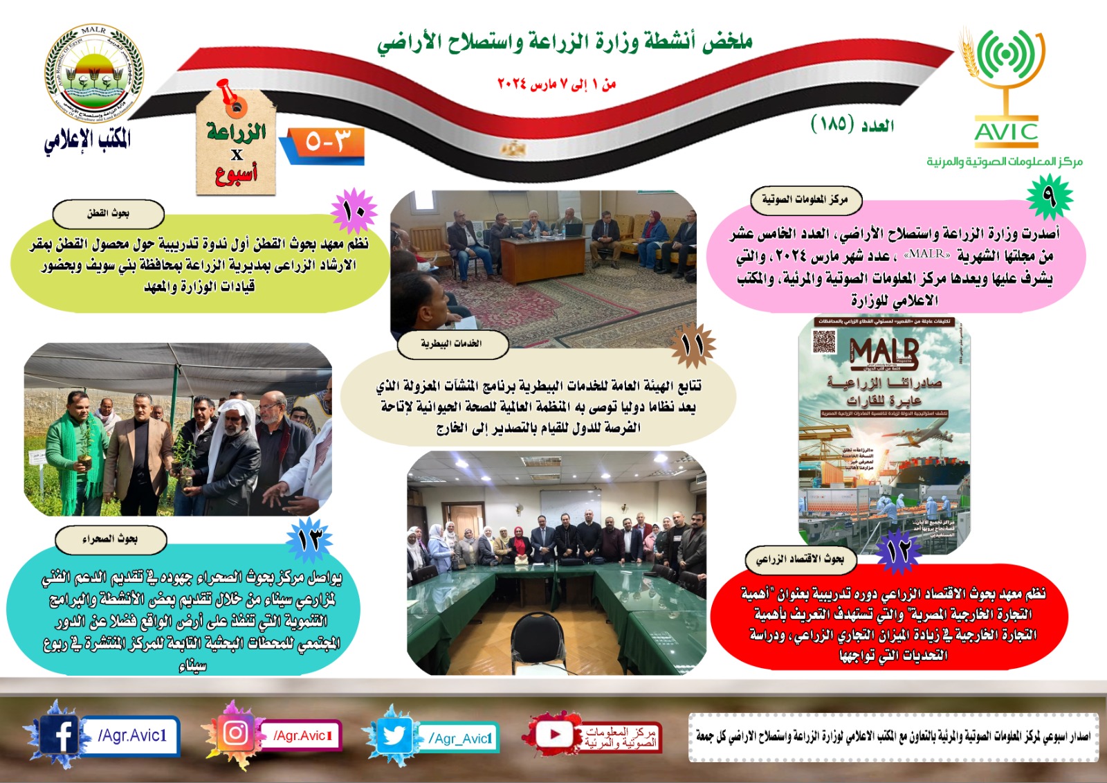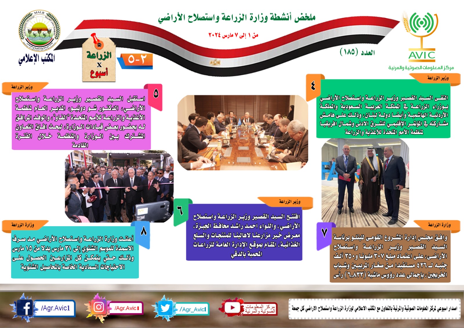 "الزراعة في أسبوع" نشرة الحصاد رقم 185 لأنشطة الوزارة في الفترة من 1 الى 7 مارس الجاري