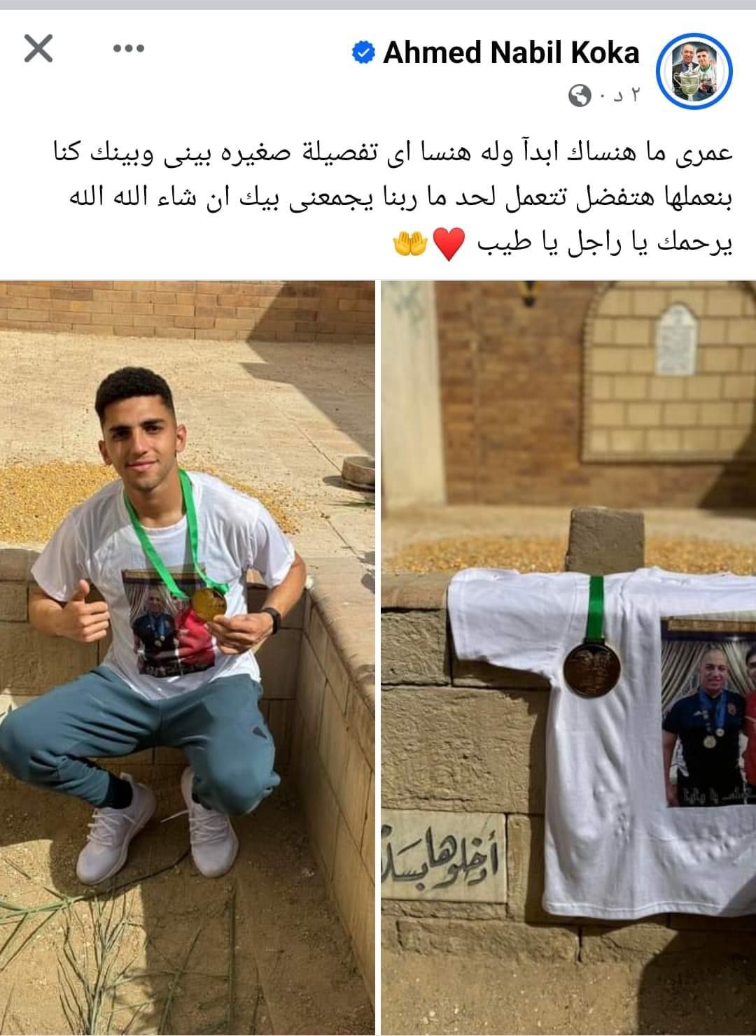 نشر أحمد نبيل كوكا صورا عبر صفحته الشخصية على موقع التواصل الاجتماعي «فيسبوك» خلال زيارته لقبر والده وهو يحمل ميدالية التتويج ببطولة كأس مصر، التي حسمها المارد الأحمر بثنائية على حساب غريمه التقليدي الزمالك، أمس الجمعة.