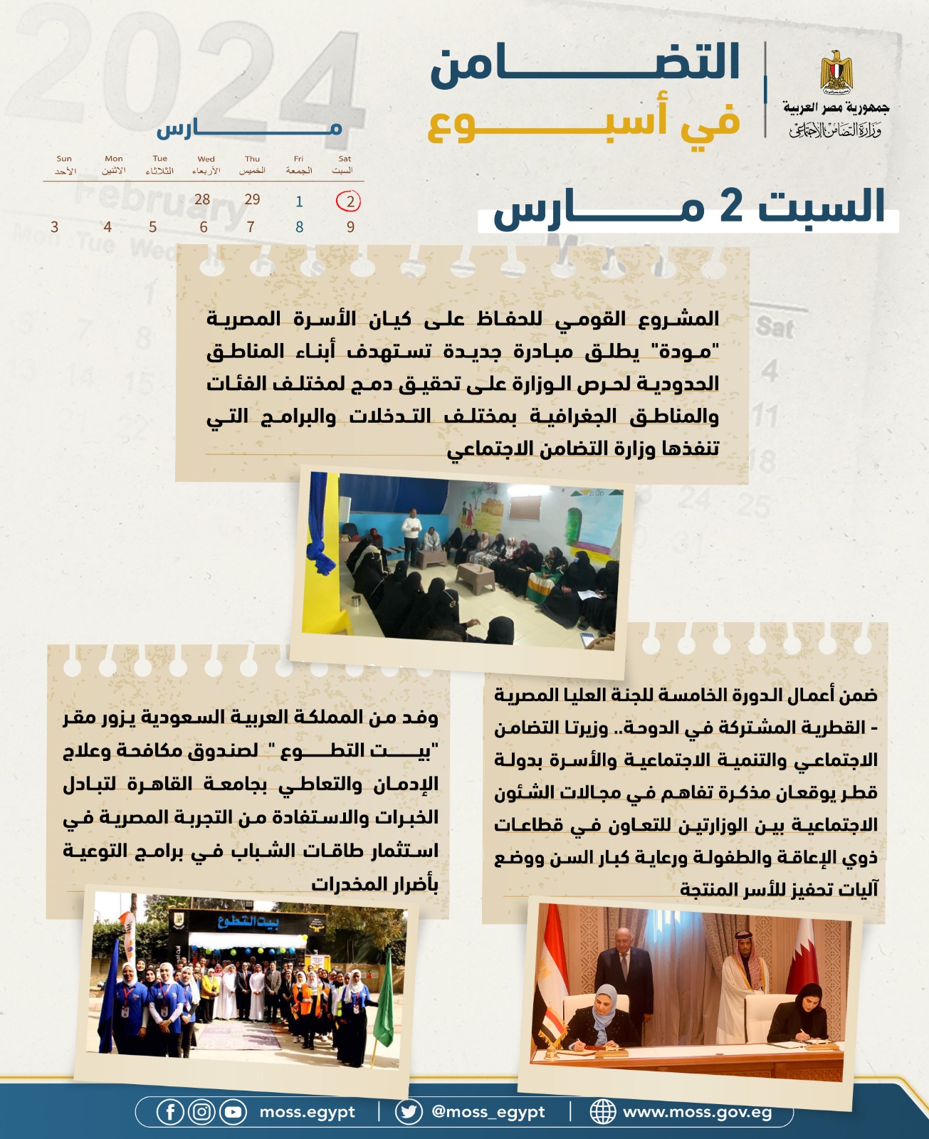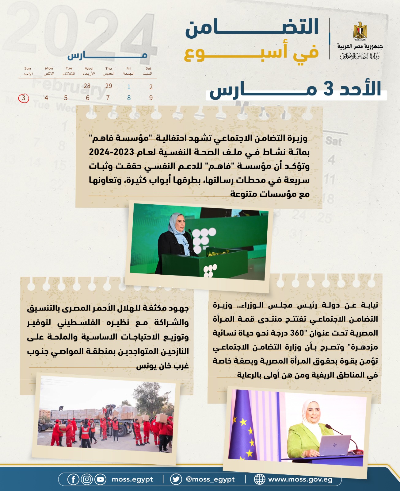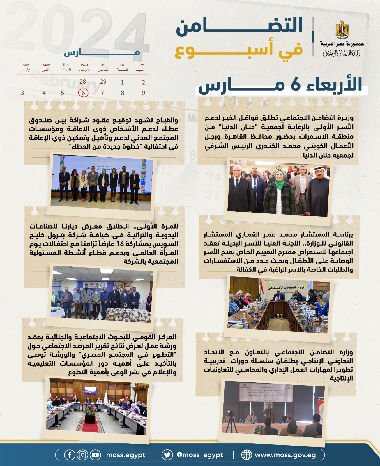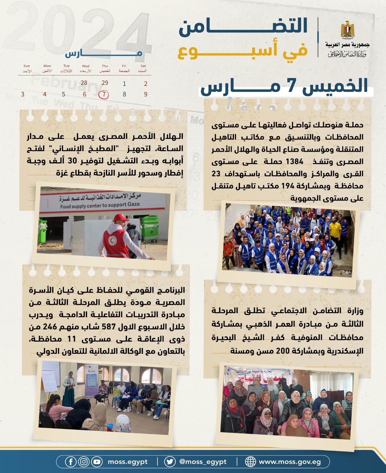 التضامن الاجتماعي في أسبوع .. الحصاد الأسبوعي لأنشطة الوزارة في الفترة من 1 مارس إلى 7 مارس 2024
