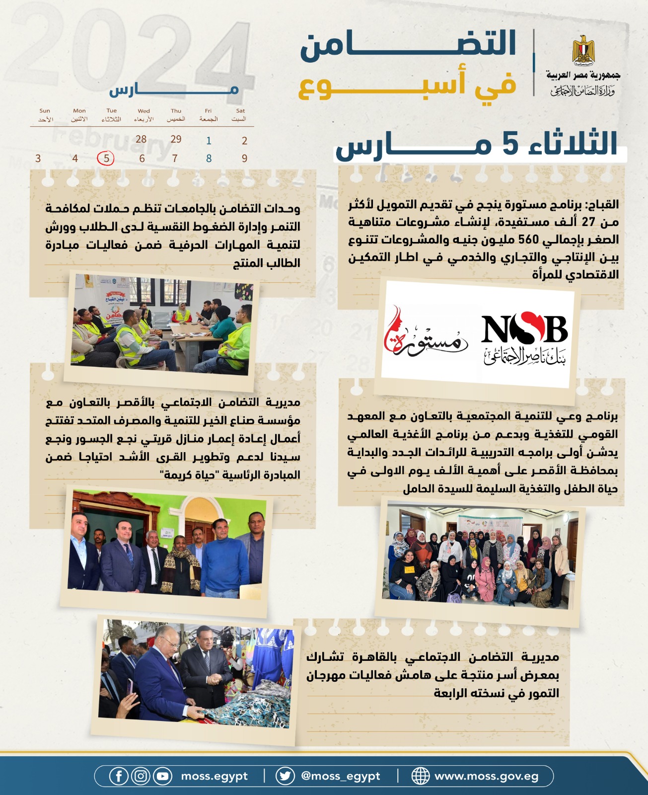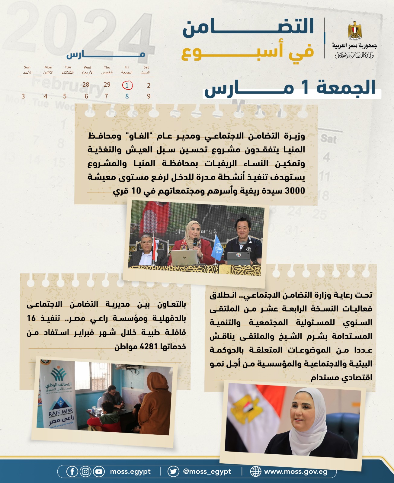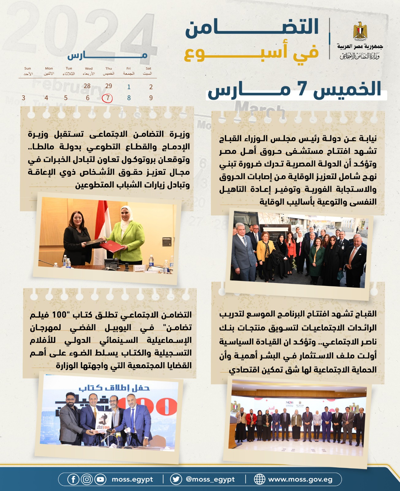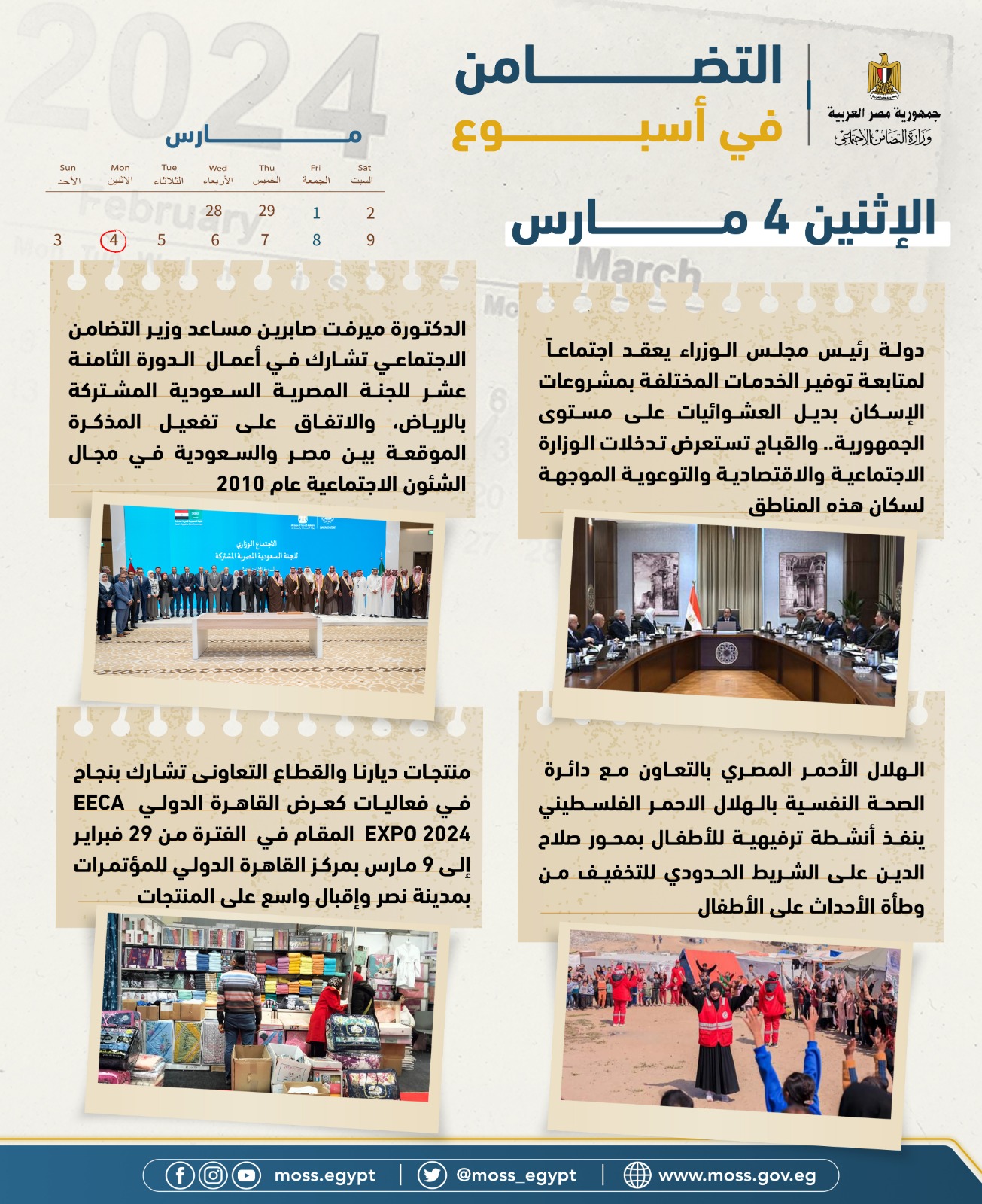 التضامن الاجتماعي في أسبوع .. الحصاد الأسبوعي لأنشطة الوزارة في الفترة من 1 مارس إلى 7 مارس 2024
