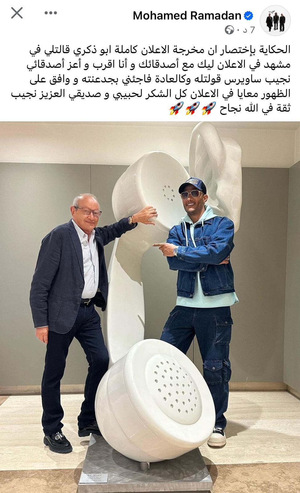 وقد نشر الفنان محمد رمضان على صفحته الرسمية على موقع فيسبوك منشور قال فيه “ الحكاية بإختصار ان مخرجة الاعلان كاملة ابو ذكري قالتلي في مشهد في الاعلان ليك مع اصدقائك وأنا أقرب وأعز أصدقائي نجيب ساويرس قولتله وكالعادة فاجئني بجدعنته و وافق على الظهور معايا في الاعلان كل الشكر لحبيبي وصديقي العزيز نجيب ثقة في الله نجاح”.