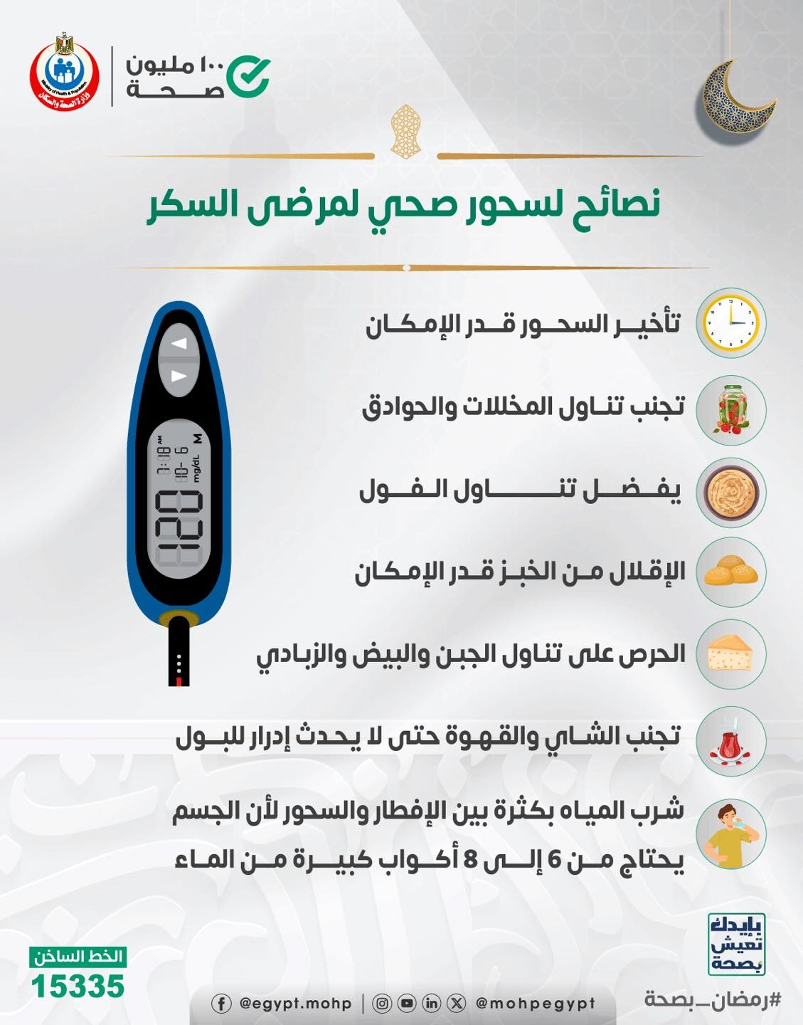 وجهت وزارة الصحة نصائح لمرضى السكر في أول سحور بشهر رمضان 2024، حيث تضمنت نصائح وزارة الصحة لسحور صحي لمرضى السكر في أول أيام شهر رمضان المبارك التالي:
