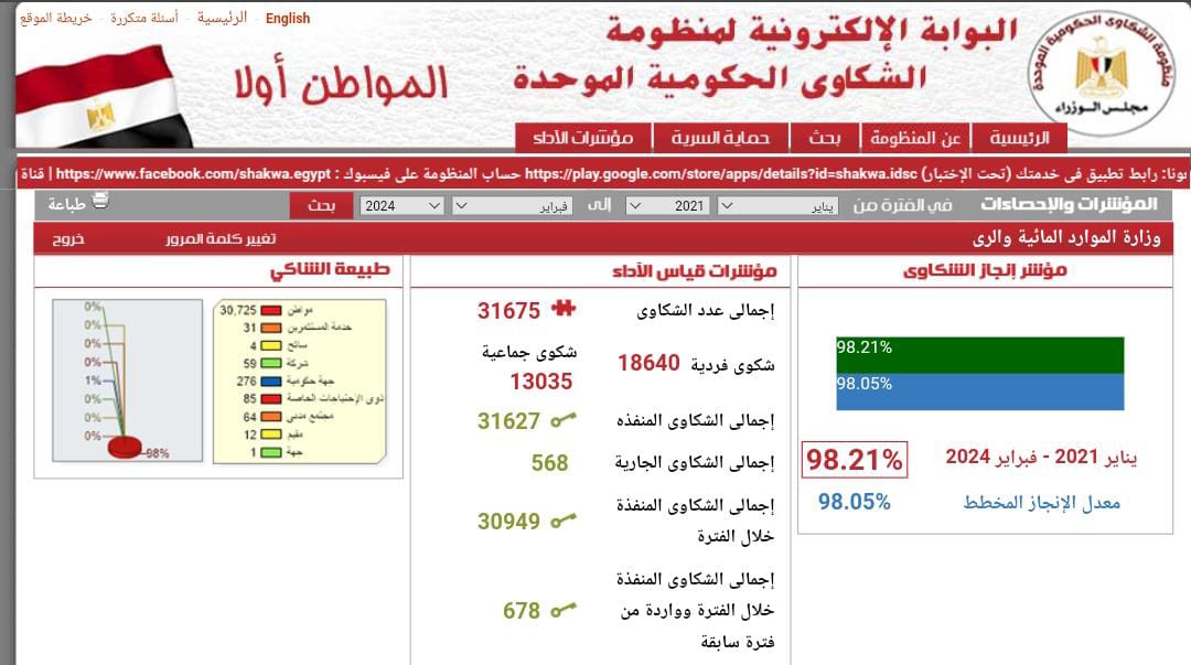 وأضاف سيادته أن مؤشر إنجاز الشكاوى بوزارة الموارد المائية والرى بمنظومة الشكاوى الحكومية الموحدة بمجلس الوزراء أوضح أن نسبة تنفيذ الشكاوى خلال الفترة من يناير 2021 حتى نهاية شهر فبراير 2024 بلغت 98.20% ، وإنتهت الوزارة من بحث ودراسة عدد 871 شكوي وطلب وإستغاثة خلال شهر فبراير 2024 .