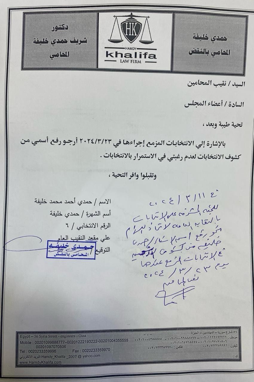 تقدم حمدي خليفة المحامي بالنقض والنقيب الأسبق، اليوم الاثنين، بخطاب إلى عبدالحليم علام نقيب المحامين، رئيس اتحاد المحامين العرب يعتذر فيه عن عدم الاستمرار في خوض انتخابات مجلس النقابة العامة للمحامين عن منصب النقيب العام، ويطالب باستبعاد اسمه من الكشوف النهائية للمرشحين عن منصب النقيب العام.
