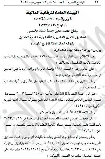 الرقابة المالية: تعديل صندوق تأمين نهاية الخدمة للعاملين بالكهرباء في شركة شمال الدلتا