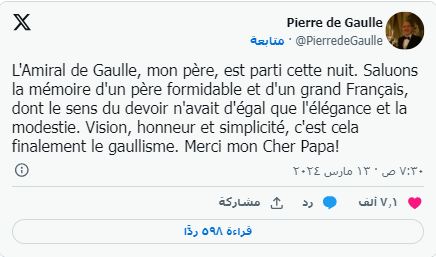 وكتب بيير ديغول ابن الراحل فيليب في حسابه على منصة "إكس": "الأميرال ديغول، والدي، لقد غادر في الليلة الماضية. دعونا نحيي ذكرى أب عظيم ورجل فرنسي عظيم، لم يكن يجاري إحساسه بالواجب نحو وطنه سوى الأناقة والتواضع. صاحب الرؤية والشرف والبساطة، هذه هي الديغولية في نهاية المطاف. شكرا لك والدي العزيز!".