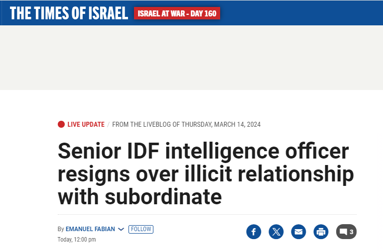 كشف صحيفة تايمز اوف إسرائيل الإسرائيلية أن ضابطا برتبة مقدم في استخبارات جيش الاحتلال قد تورط في علاقة حميمة مع ضابطة كانت تحت قيادته في منصب مهم.