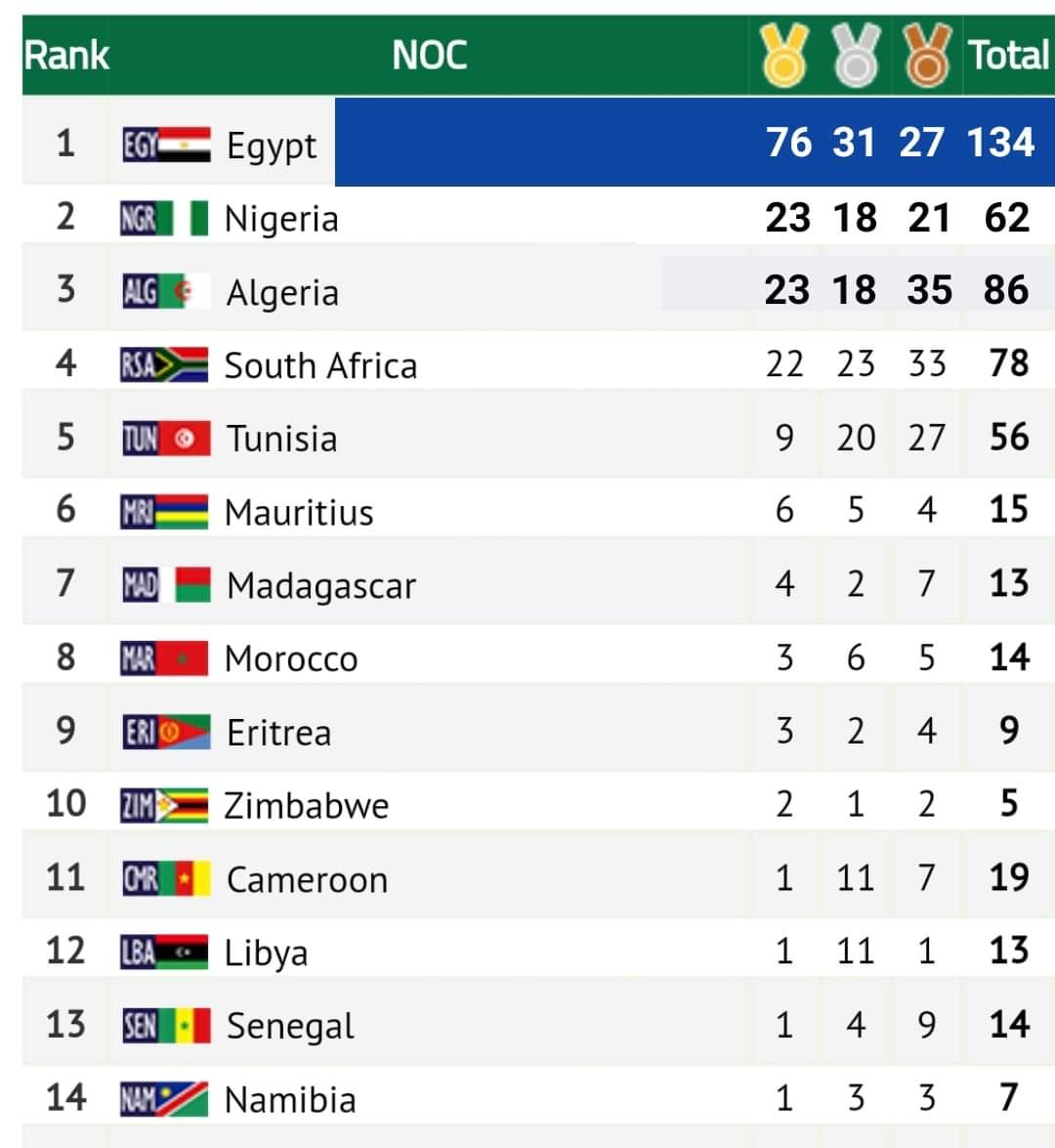 وتصدرت البعثة المصرية المشاركة فى دورة الألعاب الأفريقية جدول الميداليات خلال منافسات النسخة الثالثة عشر من دورة الألعاب الأفريقية التي تستضيفها مدينة أكرا الغانية حتى 23 مارس الحالي.