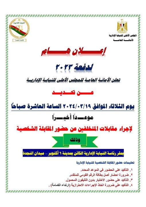كشفت النيابة الإدارية إنه بشأن الإعلان الصادر عن الأمانة العامة للمجلس الأعلى للنيابة الإدارية لمواعيد مقابلات المتخلفين عن حضور المقابلة الشخصية لمسابقة شغل وظيفة معاون نيابة إدارية من خريجي دفعة 2023.
