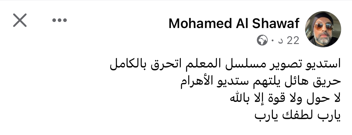 أعلن محمد الشواف سيناريست مسلسل المعلم بطولة النجم مصطفى شعبان، حريق ستوديو مسلسل المعلم بالكامل، وذلك أثناء تصوير المسلسل.