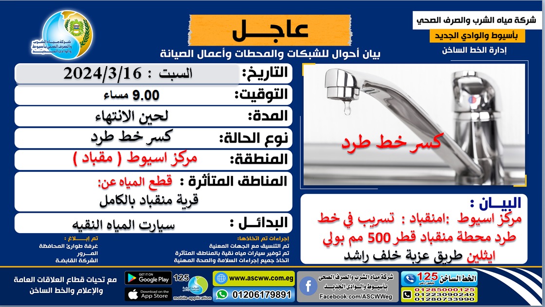 علما بأن الشركة تفتح جميع قنوات التواصل مع المواطنين على مدار اليوم فترة الإصلاح من خلال الخط ساخن 125 من أى تليفون أو الاتصال من خلال الهاتف المحمول على رقم 01280733990، و الواتس اب على رقم 01206179891، ومن خلال الصفحة الرسمية للشركة، وتطبيق الهاتف المحمول وتطبيق قراءتى المجانى، وبرنامج CMS الإلكتروني، للإبلاغ عن أى احتياج لسيارات مياه نقية.