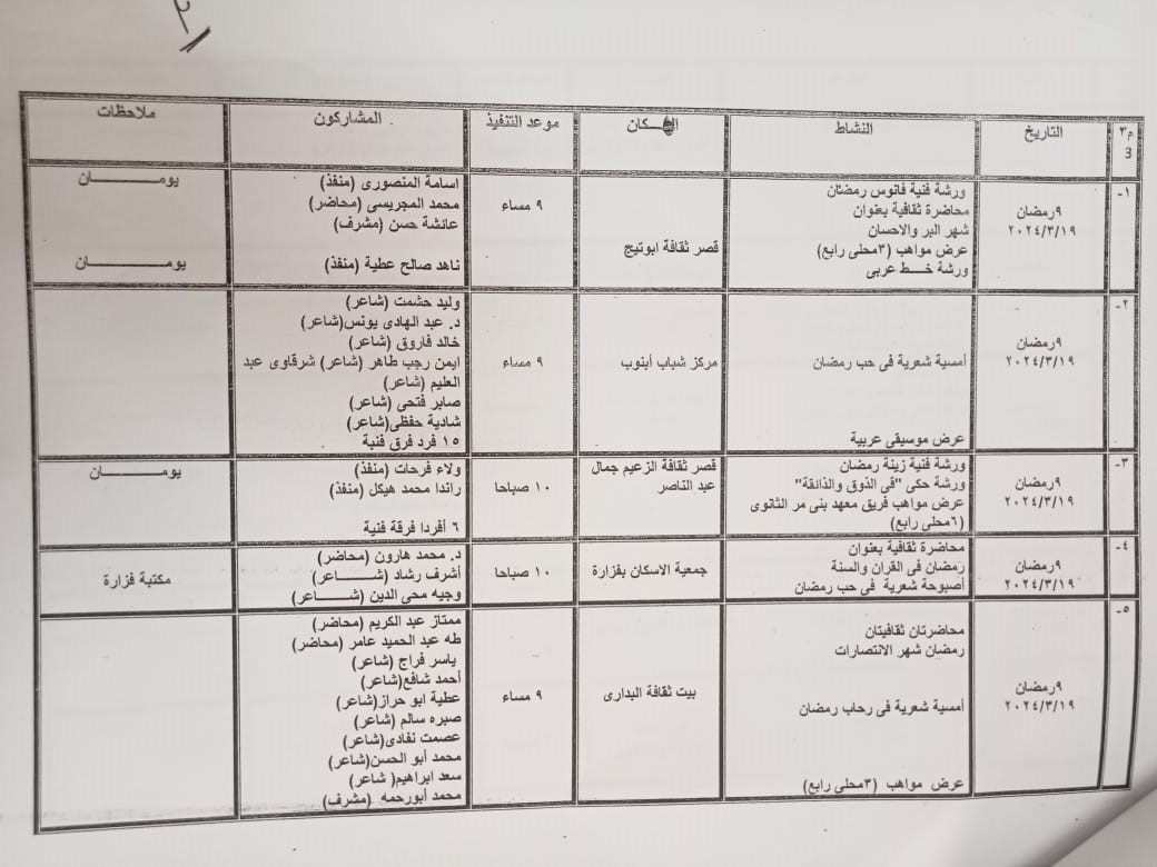 قال اللواء عصام سعد محافظ أسيوط إنه جاري تنظيم سلسلة من الأنشطة والفاعليات الثقافية والفنية من احتفالات وليالي ثقافية ومحاضرات وأمسيات شعرية وابتهالات دينية وورش وعروض فنية وموسيقية وأمسيات أدبية ورمضانية وغيرها بقصور الثقافة المنتشرة بمختلف مراكز ومدن المحافظة خلال شهر رمضان الكريم وذلك ضمن خطة اقليم وسط الصعيد الثقافي والإدارة العامة لفرع ثقافة أسيوط بهدف اسعاد المواطنين خلال الشهر الكريم ورفع الوعي لديهم وتحقيق طفرة ثقافية بالمحافظة داعياً كافة المواطنين بالإستمتاع بهذه الفاعليات لافتاً إلى اهتمام الدولة بقيادة الرئيس عبدالفتاح السيسي رئيس الجمهورية ببناء الانسان ورفع الوعي ونشر الثقافة والفنون.