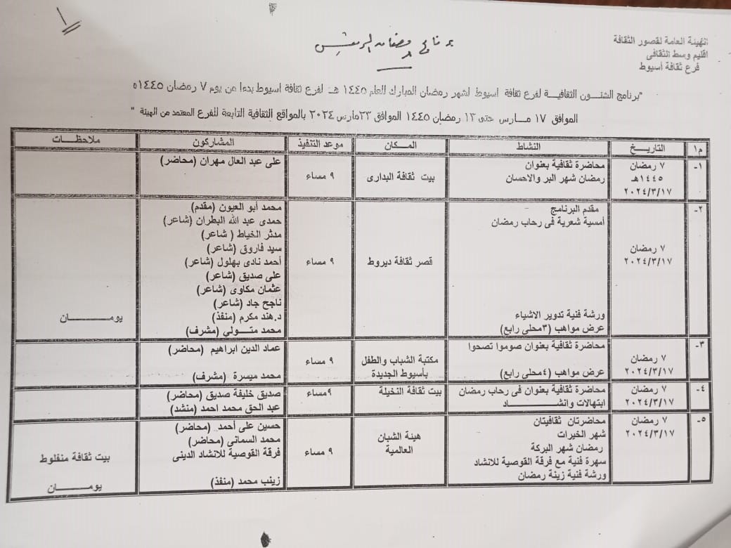 من جانبه أوضح ضياء مكاوي رئيس الإدارة المركزية لاقليم وسط الصعيد الثقافي إن برنامج الفعاليات الثقافية بدأ من يوم 15 مارس الجاري الموافق 5 رمضان ويستمر حتى 31 مارس 2024 الموافق 20 رمضان في أجواء رمضانية تحت رعاية الدكتورة نيفين الكيلاني وزيرة الثقافة واللواء عصام سعد محافظ أسيوط حيث بدأت أولى فعاليات البرنامج في 15 مارس الجاري بعروض مهرجان المسرح الاقليمي لنوادي المسرح التي تستمر حتى 19 مارس وذلك على مسرح قصر ثقافة أسيوط لفرق (أسيوط – سوهاج - المنيا) فضلًا عن إقامة احتفالات وندوات في المواقع الثقافية التابعة لفرع ثقافة أسيوط في مختلف المراكز والمدن في الفترة من 17 مارس وحتى 23 مارس وتتضمن محاضرات ثقافية وأمسيات وسهرات شعرية وورش فنية وورش حكي وعرض مواهب واصبوحات ثقافية وانشاد وابتهالات دينية وعروض لفرقة الموسيقى العربية وفرقة القوصية للانشاد الديني كما سيتم تنظيم بعض الفعاليات والاحتفالات بمقر قصر ثقافة أسيوط الكائن بميدان البنوك في الفترة من 21 مارس الموافق 10 رمضان وحتى 25 مارس الموافق 15 رمضان وتتضمن عروض فنية لفرق الموسيقى العربية وورش فنية للرسم والحكي ومعرض فن تشكيلي ونادي للسينما وأمسيات شعرية وعرض استكشات فنية وعرض حواديت بالعرائس وورش ألعاب شعبية ومحاضرات ثقافية ودينية وتختتم الفعاليات ببرنامج لليالي أسيوط الثقافية والفنية بفرع ىثقافة أسيوط في الفترة من 27 مارس الموافق 16 رمضان وحتى 31 مارس الموافق 20 رمضان تتخللها عرض أفلام تسجيلية عن إنجازات الرئس وأمسيات شعرية وعروض للمواهب وابتهالات واناشيد دينية وعروض فنية لفرقة أسيوط للموسيقى العربية علاوة على معرض كتب لاصدارات الهيئة خلال تلك الفترة.