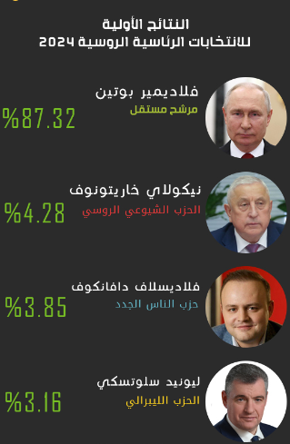 لجنة الانتخابات الروسية: نسبة المشاركة في الانتخابات الرئاسية سجلت رقما قياسيا في تاريخ روسيا ، وبلغت 77.44% حيث صوت أكثر من 87.1 مليون مواطن و بوتين يتصدر المشهد بنسبة 87.3%