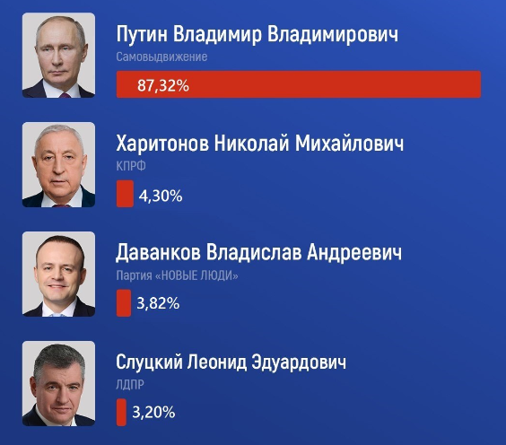 وذكرت أنه بعد معالجة 99.7% من الأصوات، يتصدر المرشح المستقل فلاديمير بوتين النتائج بنسبة 87.3%، يليه نيكولاي خاريتونوف بنسبة 4.3%، وفلاديسلاف دافانكوف 3.83% وليونيد سلوتسكي 3.21% حسبما أفادت لجنة الانتخابات المركزية.