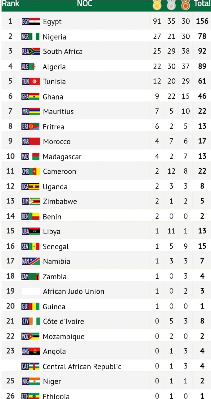 واصلت البعثة الرياضية المصرية المشاركة فى دورة الألعاب الأفريقية الثالثة عشر بالعاصمة الغانية أكرا خلال الفترة من 8 حتى 23 مارس الحالى تفوقها وتصدرها لترتيب منافسات فى مختلف الالعاب برصيد " 156" ميدالية متنوعة " 91 ذهبية، 35 فضية، 30 بروزنزية ".