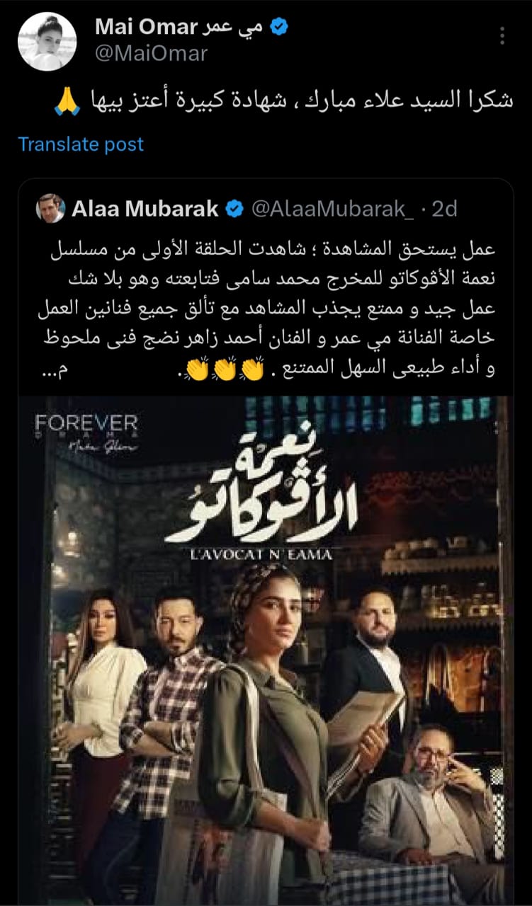 ردت الفنانة مي عمر على منشور علاء مبارك نجل الرئيس الراحل محمد حسني مبارك، بعد أن أشاد بدورها في مسلسل "نعمة الأفوكاتو" على منصة "x"، تويتر سابقًا.