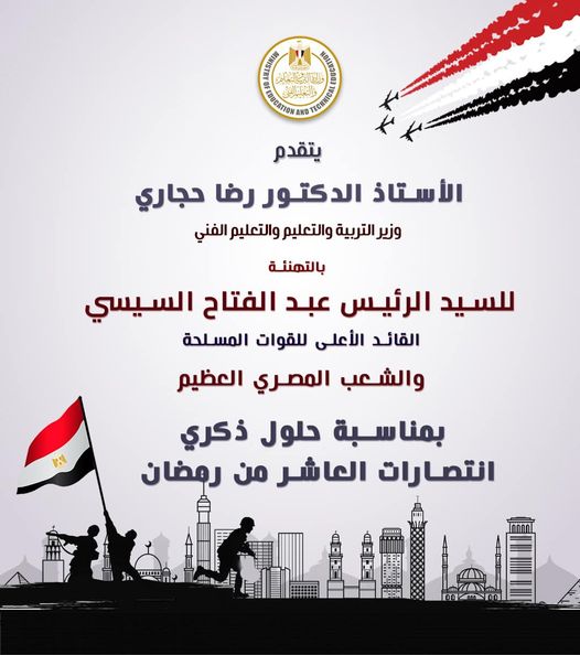 يتقدم الدكتور رضا حجازي وزير التربية والتعليم والتعليم الفني بخالص التهنئة للرئيس عبدالفتاح السيسي رئيس الجمهورية القائد الأعلى للقوات المسلحة والشعب المصري العظيم بمناسبة حلول ذكرى انتصارات العاشر من رمضان التي سطرت خلالها قواتنا المسلحة ملحمة بطولية بدماء وشجاعة رجالها في سبيل الحفاظ والدفاع عن أمن الوطن واستقراره..سائلا المولى عز وجل أن يحفظ مصر وقيادتها الحكيمة وأن يتغمد شهداء الوطن بواسع رحمته وأن يديم على مصرنا الغالية الأمن والسلام والرخاء والاستقرار.