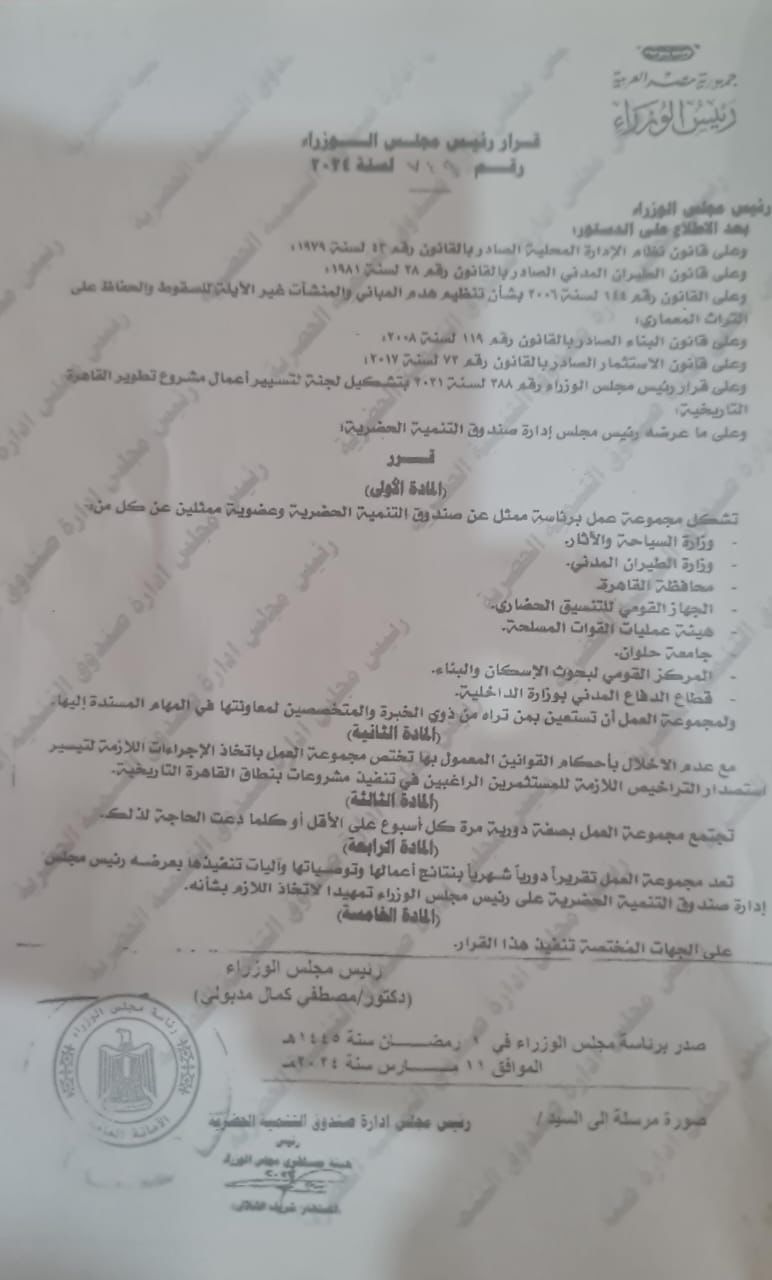 أصدر الدكتور مصطفى مدبولى، رئيس مجلس الوزراء ، قرار بتشكيل مجموعة عمل برئاسة صندوق التنمية الحضرية وعضوية جهات عديدة ذات الصلة.