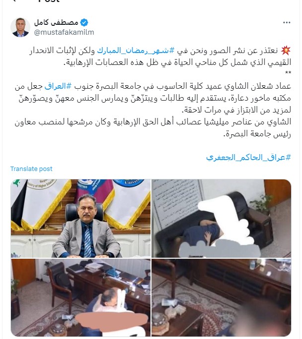 والعميد المتهم هو عميد كلية الحاسوب وتكنولوجيا المعلومات في جامعة البصرة عماد الشاوي، وفق ما أكده طلاب الجامعة.