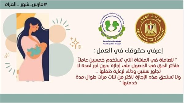 أطلقت وزارة العمل، مبادرة بعنوان "إعرفى حقوقك فى العمل"، وذلك بالتزامن مع الاحتفالات التى يشهدها شهر مارس بالمرأة، وعلى رأسها عيد الأم، واليوم العالمي للمرأة، وذلك بهدف تعريف المرأة العاملة بحقوقها وفقا للقانون.