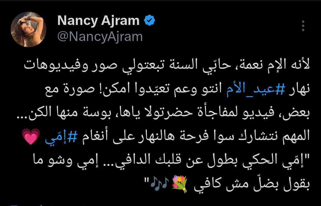 و كتبت نانسي عجرم على حسابها الخاص على موقع إكس “تويتر سابقا” قائلة : "لأنه الإم نعمة، حابّي السنة تبعتولي صور وفيديوهات نهار عيد الأم انتو وعم تعيّدوا امكن! صورة مع بعض، فيديو لمفاجأة حضرتولا ياها، بوسة منها الكن… المهم نتشارك سوا فرحة هالنهار على أنغام إمّي"، مضيفةً: "إمّي الحكي بطول عن قلبك الدافي… إمي وشو ما بقول بضلّ مش كافي".