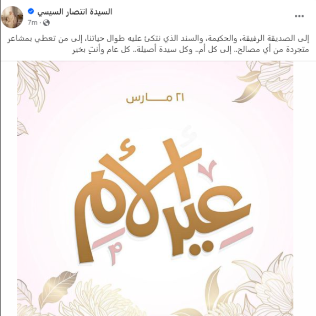قائلة: إلى الصديقة الرفيقة، والحكيمة، والسند الذي نتكئ عليه طوال حياتنا، إلى من تعطي بمشاعر متجردة من أي مصالح.. إلى كل أم.. وكل سيدة أصيلة.. كل عام وأنتِ بخير.