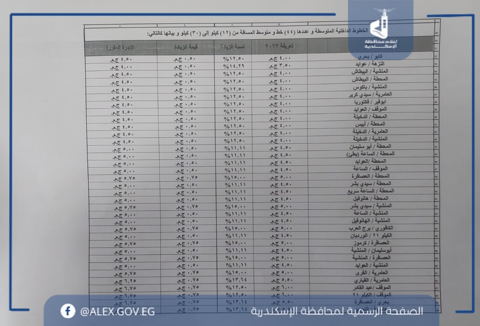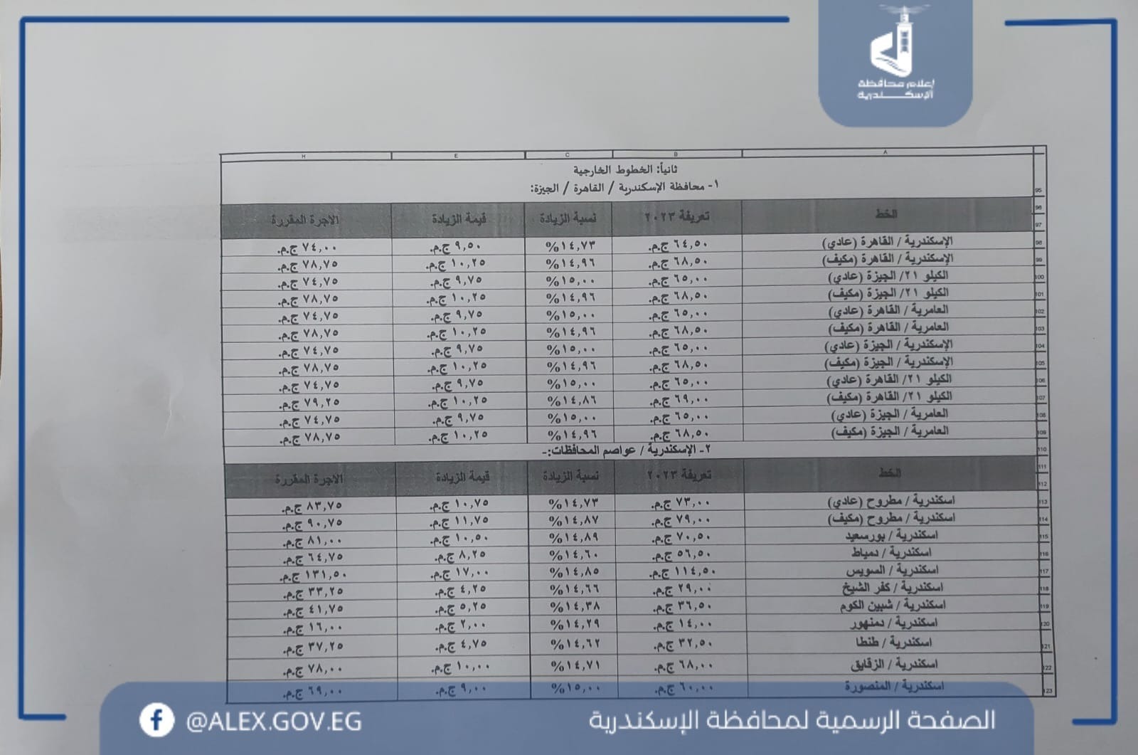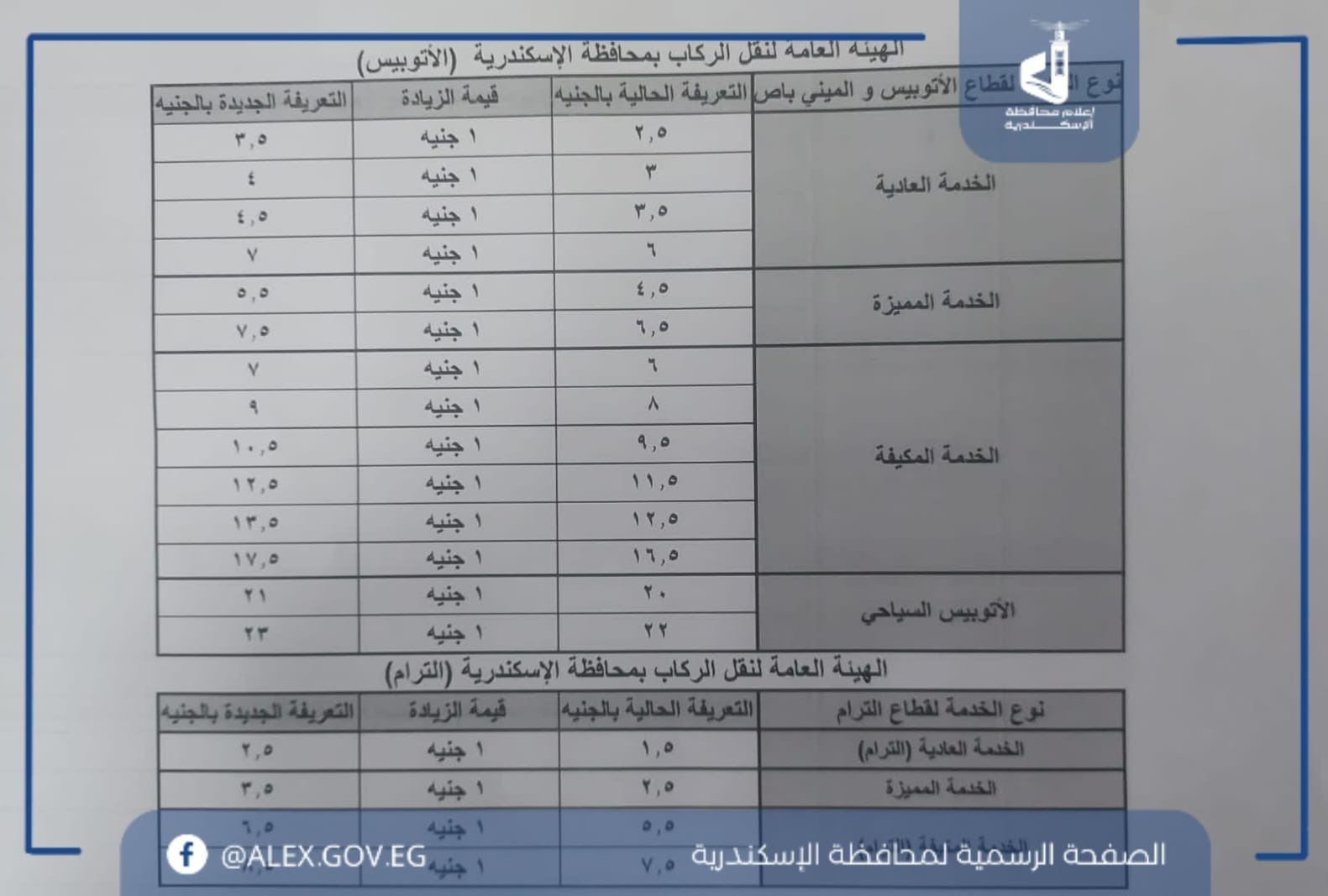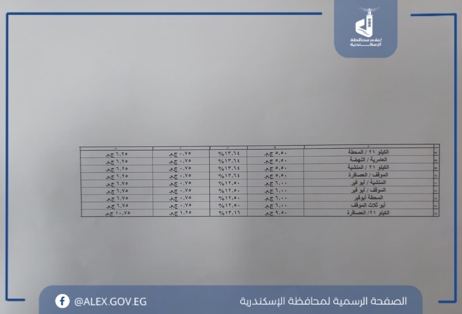 وكلف محافظ الإسكندرية إدارة مشروع محطات الركاب والانتظار، بطباعة ملصقات بالتعريفة الجديدة والالتزام بنشرها بالمواقف والمحطات المختلفة وتعليقها في مكان واضح.