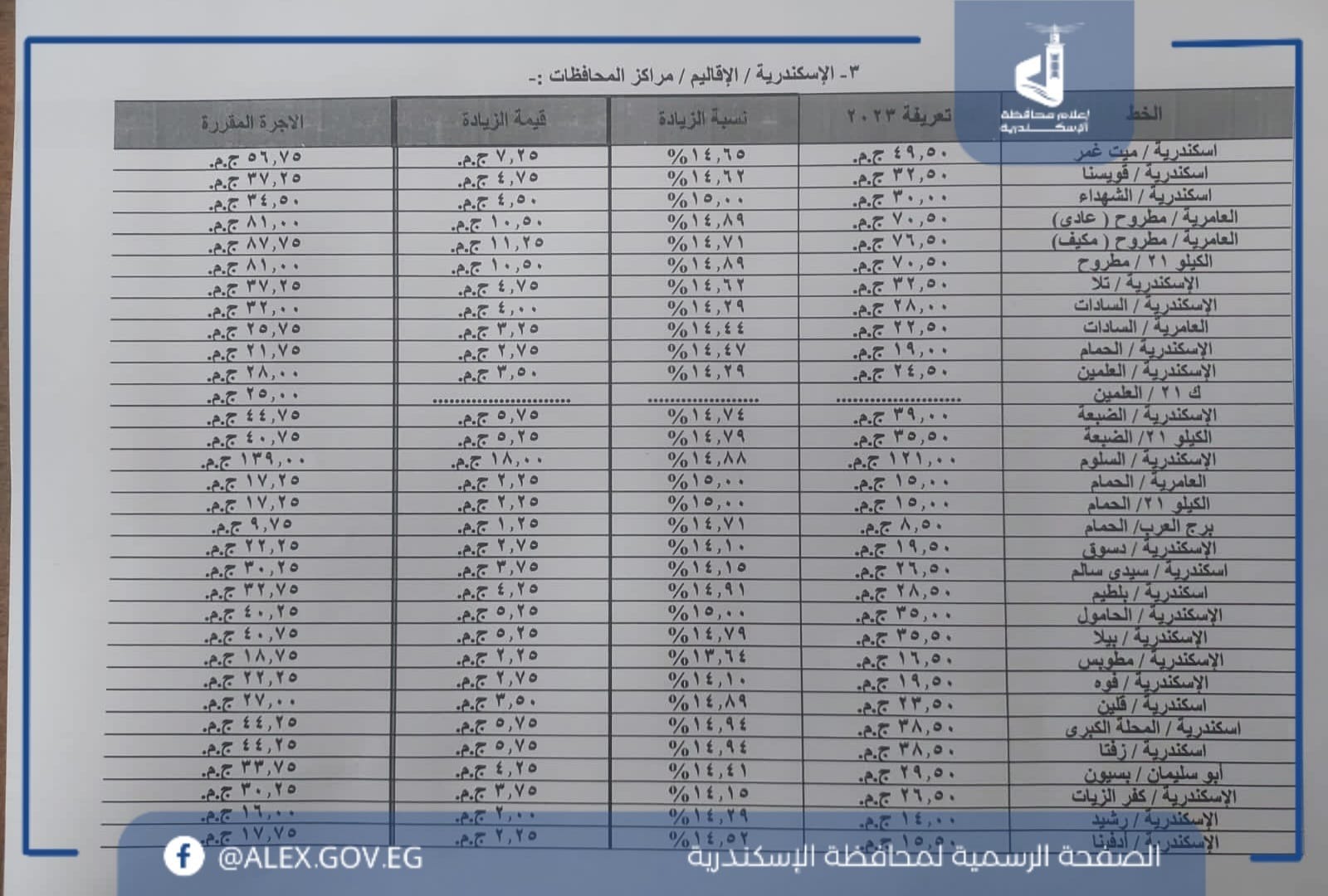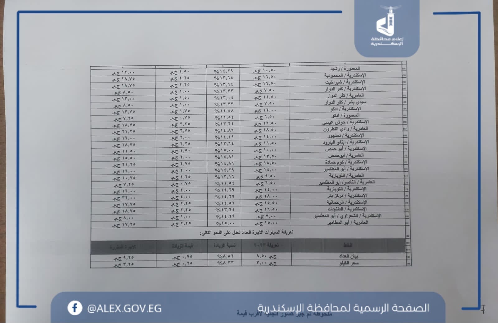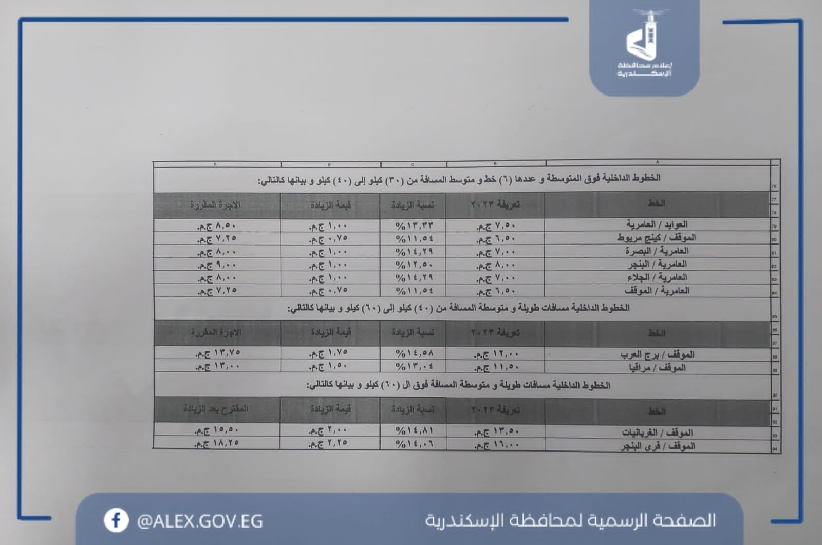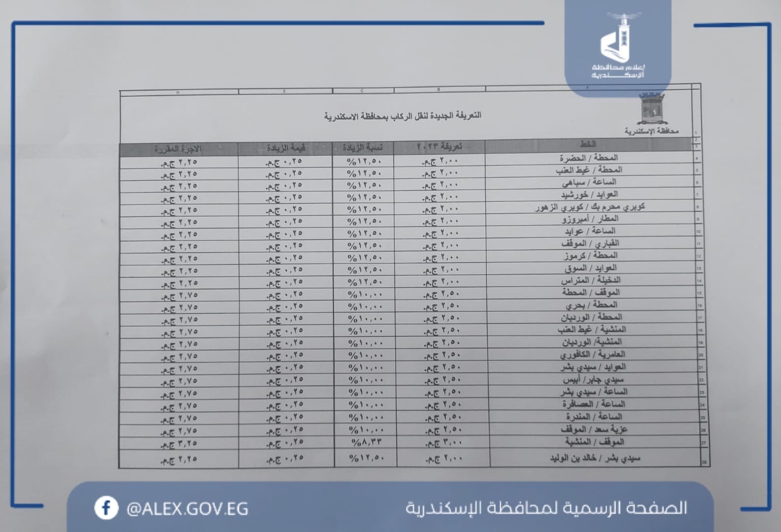 ووجه محافظ الإسكندرية الأجهزة المعنية من إدارة المرور ورؤساء الأحياء وإدارة المواقف والهيئة العامة لنقل الركاب ومسؤولي التموين، بالرقابة والمتابعة على مدار الساعة للتأكد من الإلتزام بالتعريفة الجديدة وعدم استغلال المواطنين.