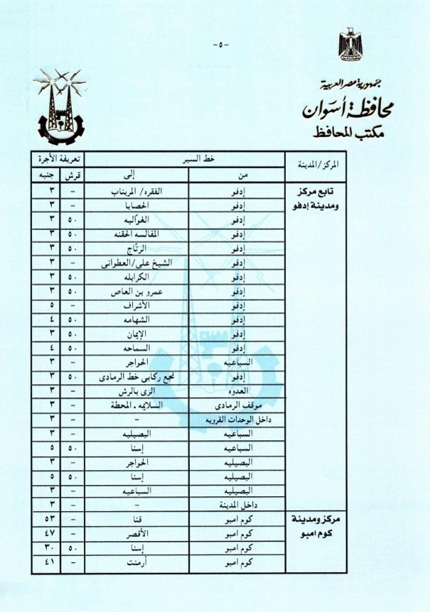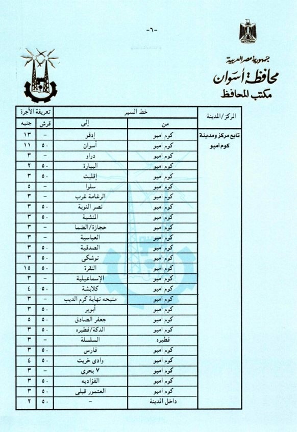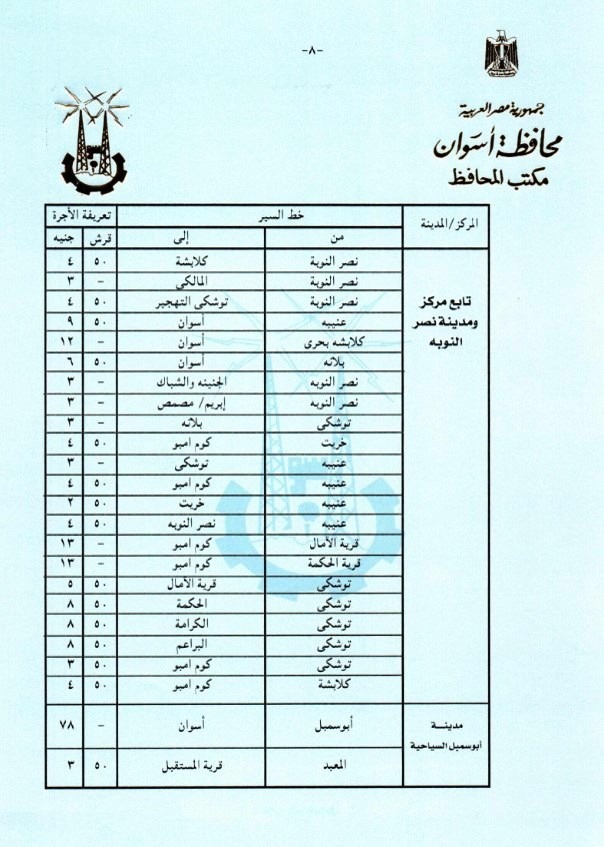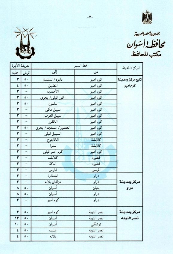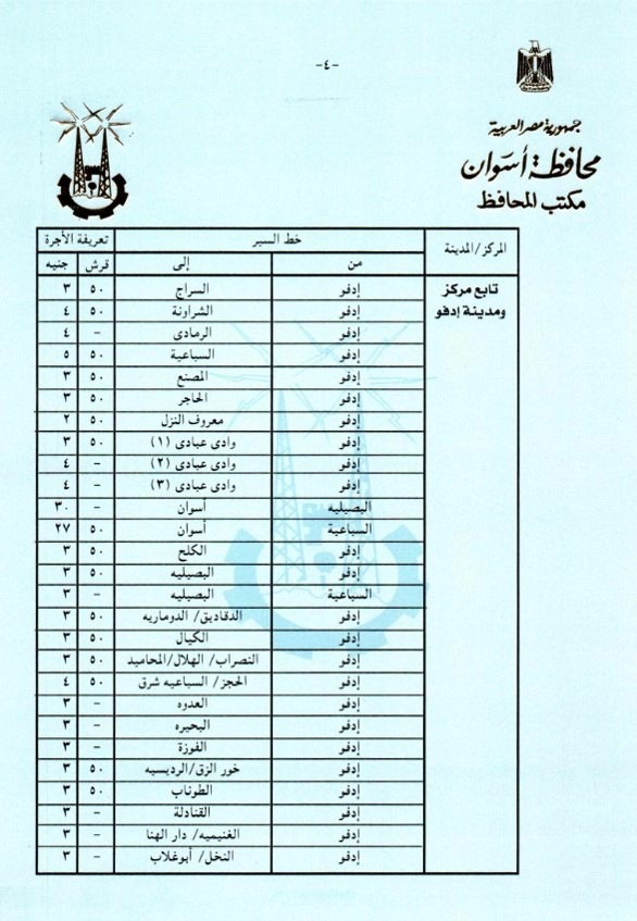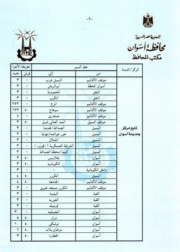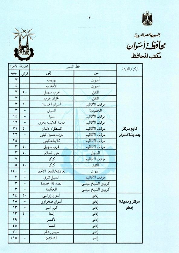وأعطى اللواء أشرف عطية توجيهاته لإدارتى المرور ومشروع المواقف بالمحافظة ، وأيضاً نقابة العاملين بالنقل البرى بالقيام بالمتابعة الميدانية المستمرة لمراعاة تطبيق التعريفة الجديدة ، والتى تم إقرارها وتنفيذها من صباح اليوم الجمعة 22 مارس الجارى وفقاً لقرارات لجنة التسعير التلقائى للمنتجات البترولية بشأن تصحيح أسعار هذه المنتجات ، والتى زادت بنسبة من 10% إلى 15 % على خطوط السير المختلفة بنطاق محافظة أسوان ، وبنسبة 10 % على التاكسى ، مع التأكد من تسليم السائقين الكارتات والتعامل مع أي مشاكل لجمهور الركاب ، على أن يتم بالتوازى وضع التعريفة الجديدة على زجاج كل سيارة ، والإطمئنان من المواطنين أنفسهم على إلتزام السائقين بالتعريفة المقررة ، مكلفاً رؤساء الوحدات المحلية للمراكز والمدن بدائرة المحافظة بالتنسيق مع المرور والمواقف لمتابعة تطبيق ذلك بشكل لحظى ، فضلاً عن عمل لافتات إرشادية موضحاً بها التعريفة الجديدة بكل موقف ، مع قيام أجهزة مديرية الأمن بإتخاذ التدابير والإجراءات اللازمة لإستمرار العمل بالتعريفة المقررة لمنع أى إستغلال لجمهور الركاب .