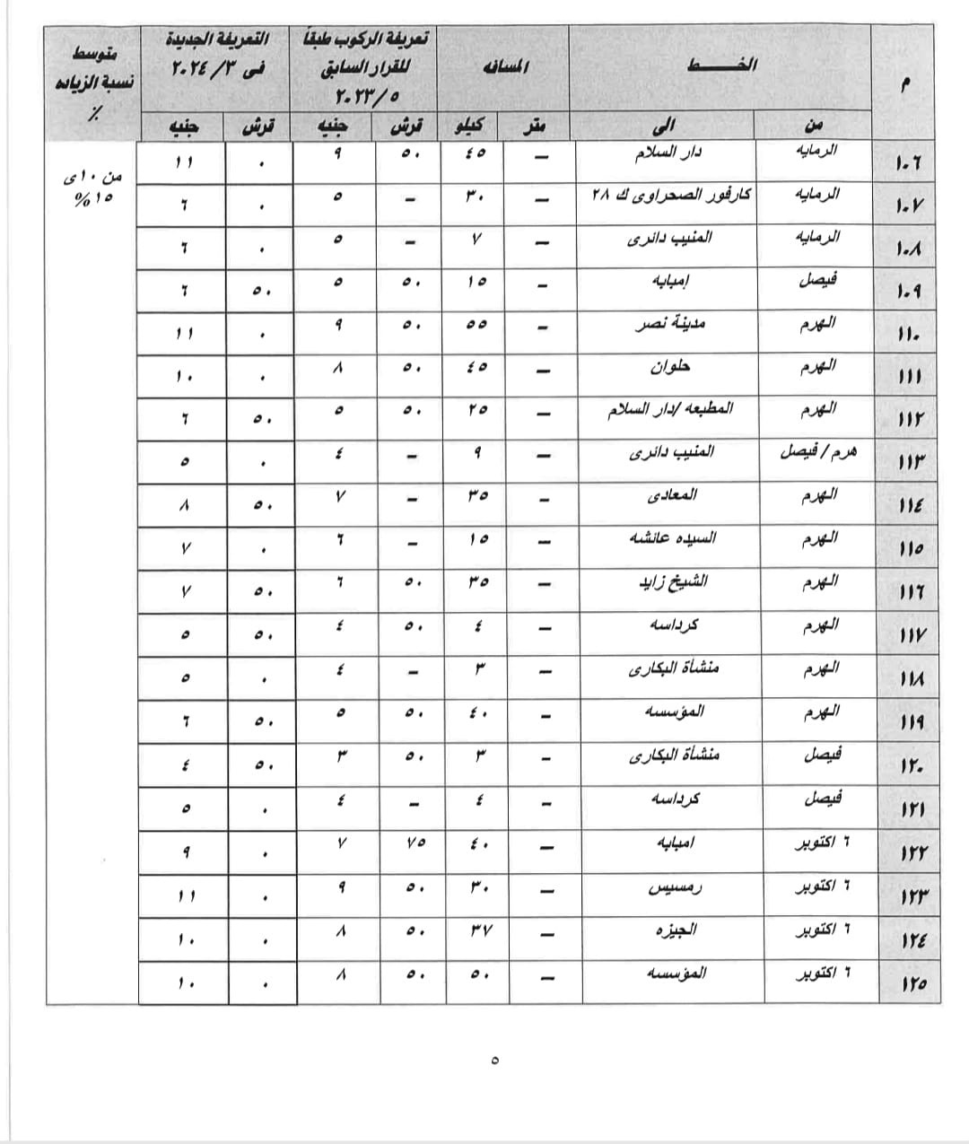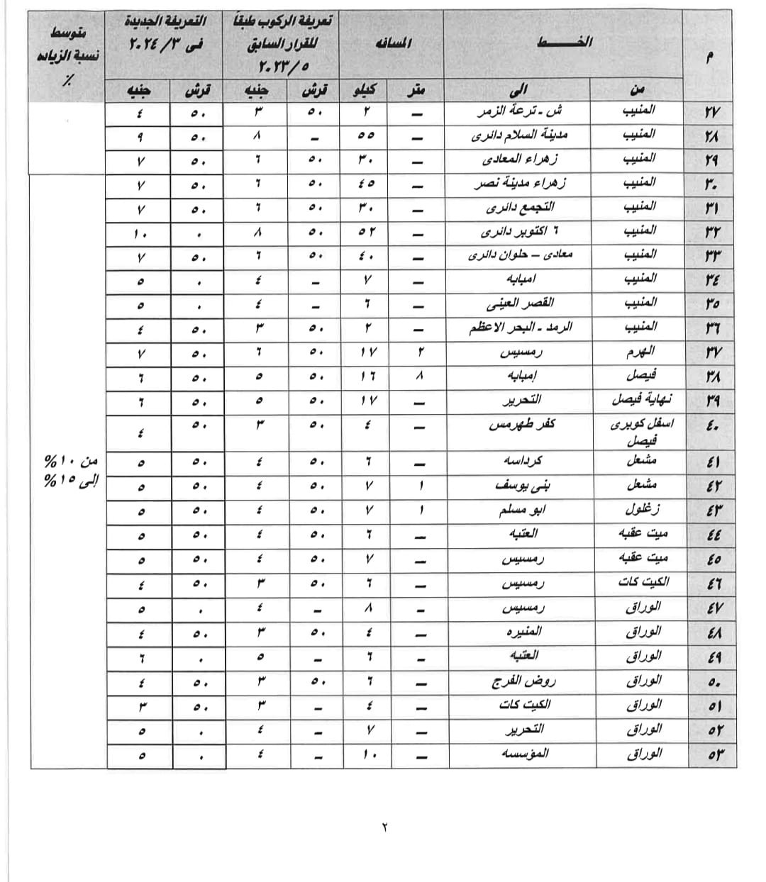 اعتمد اللواء أحمد راشد محافظ الجيزة التعريفة الجديدة لسيارات السرفيس والنقل الجماعي الداخلية والخارجية، والتي يتم تطبيقها اعتبارًا من اليوم الجمعة وطبقًا للجداول المرفقة وذلك في ضوء قرار لجنة التسعير التلقائي للمنتجات البترولية بوزارة البترول،بتحريك أسعار المنتجات البترولية.
