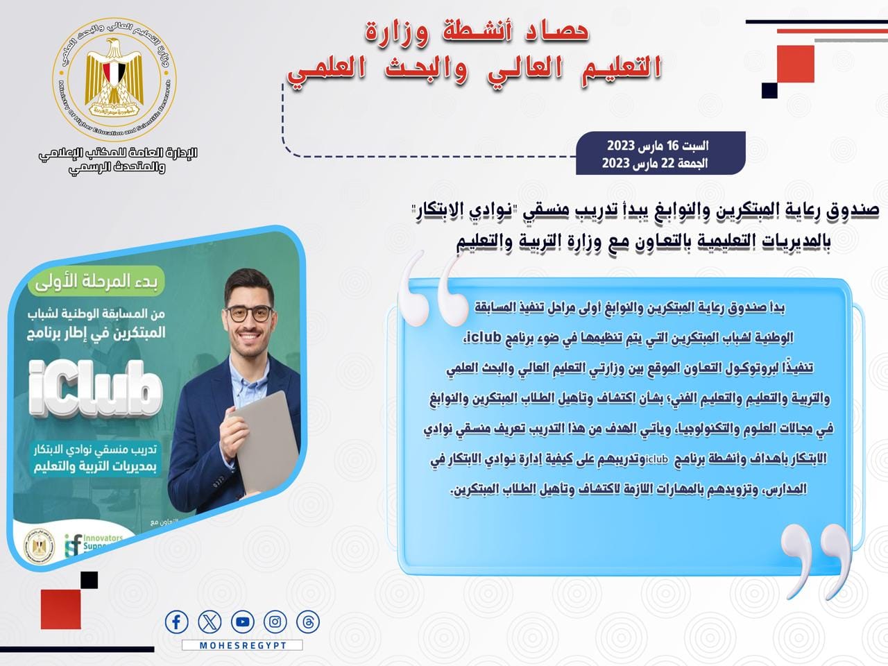 10) بدأ صندوق رعاية المبتكرين والنوابغ أولى مراحل تنفيذ المسابقة الوطنية لشباب المبتكرين التي يتم تنظيمها في ضوء برنامج iclub، تنفيذًا لبروتوكول التعاون الموقع بين وزارتي التعليم العالي والبحث العلمي والتربية والتعليم والتعليم الفني؛ بشأن اكتشاف وتأهيل الطلاب المبتكرين والنوابغ في مجالات العلوم والتكنولوجيا، ويأتي الهدف من هذا التدريب تعريف منسقي نوادي الابتكار بأهداف وأنشطة برنامج iclubوتدريبهم على كيفية إدارة نوادي الابتكار في المدارس، وتزويدهم بالمهارات اللازمة لاكتشاف وتأهيل الطلاب المبتكرين.