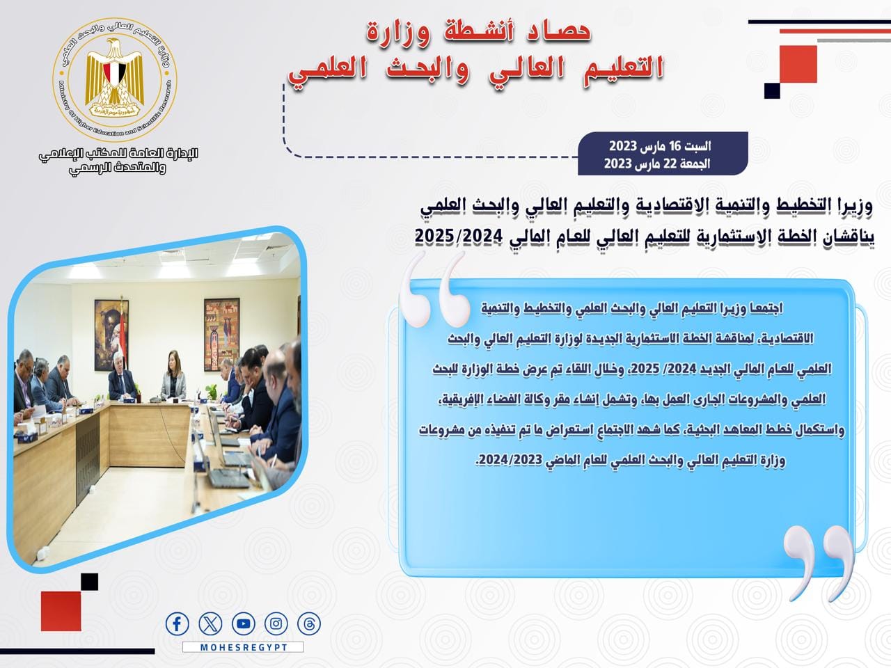 1) اجتمع وزيرا التعليم العالي والبحث العلمي والتخطيط والتنمية الاقتصادية، لمناقشة الخطة الاستثمارية الجديدة لوزارة التعليم العالي والبحث العلمي للعام المالي الجديد 2024/ 2025، وخلال اللقاء تم عرض خطة الوزارة للبحث العلمي والمشروعات الجارى العمل بها، وتشمل إنشاء مقر وكالة الفضاء الإفريقية، واستكمال خطط المعاهد البحثية، كما شهد الاجتماع استعراض ما تم تنفيذه من مشروعات وزارة التعليم العالي والبحث العلمي للعام الماضي 2023/2024.